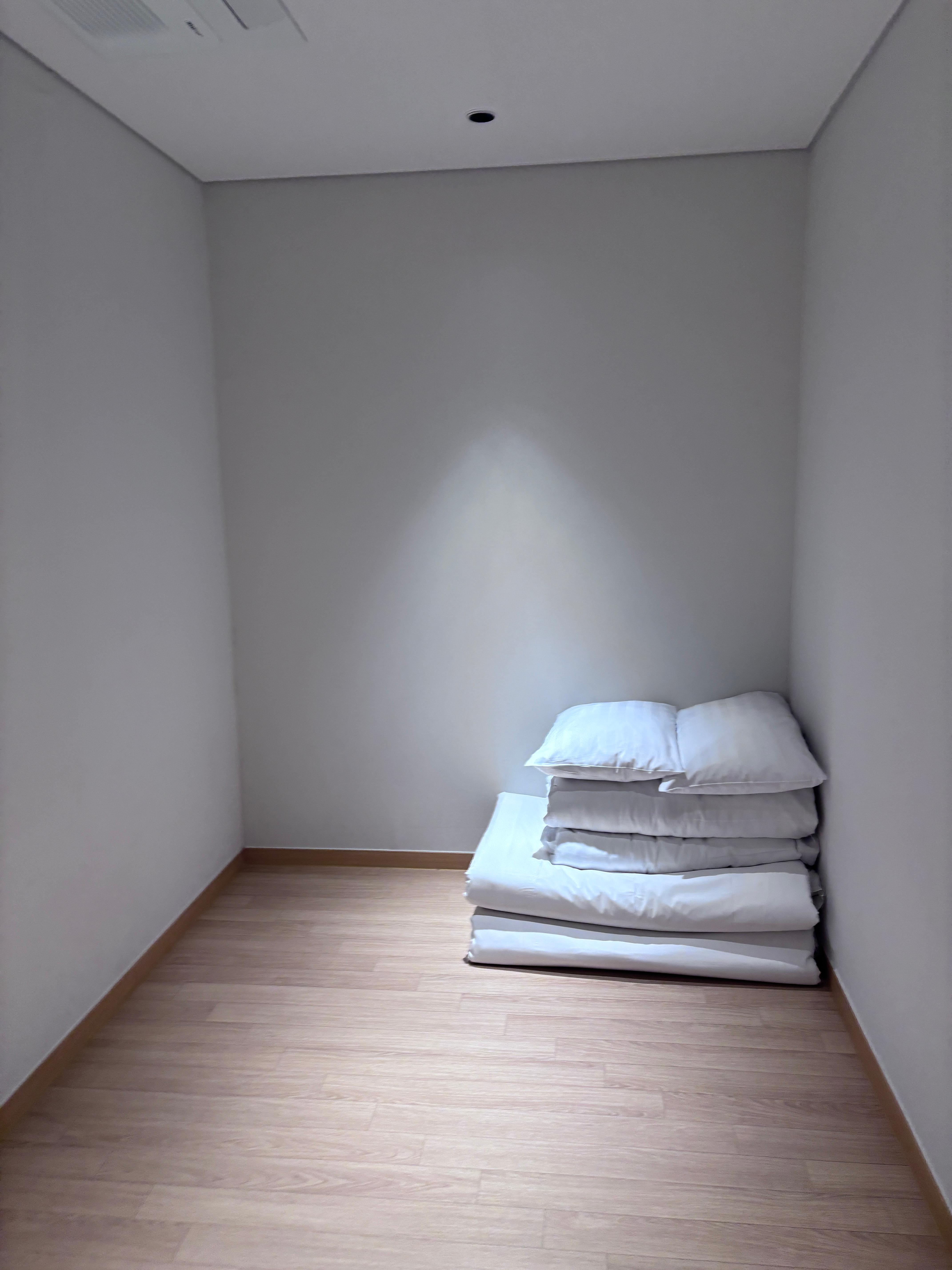 온돌방이 현관들어오면 바로 있는 방인데 맞은편에 공용 화장실이 있어요. 싱글용 매트 두개 펼치면 꽉 차는 사이즈입니다. 진짜 오차 없이 딱 들어맞아서 두개 펼치고 아이들과 저, 이렇게 셋이 잤어요. 매트 두개 펼쳐놓고 문간 옆 벽쪽엔 각종 짐들을 보관했습니다. 따로 짐 보관하는 공간이 없어요.