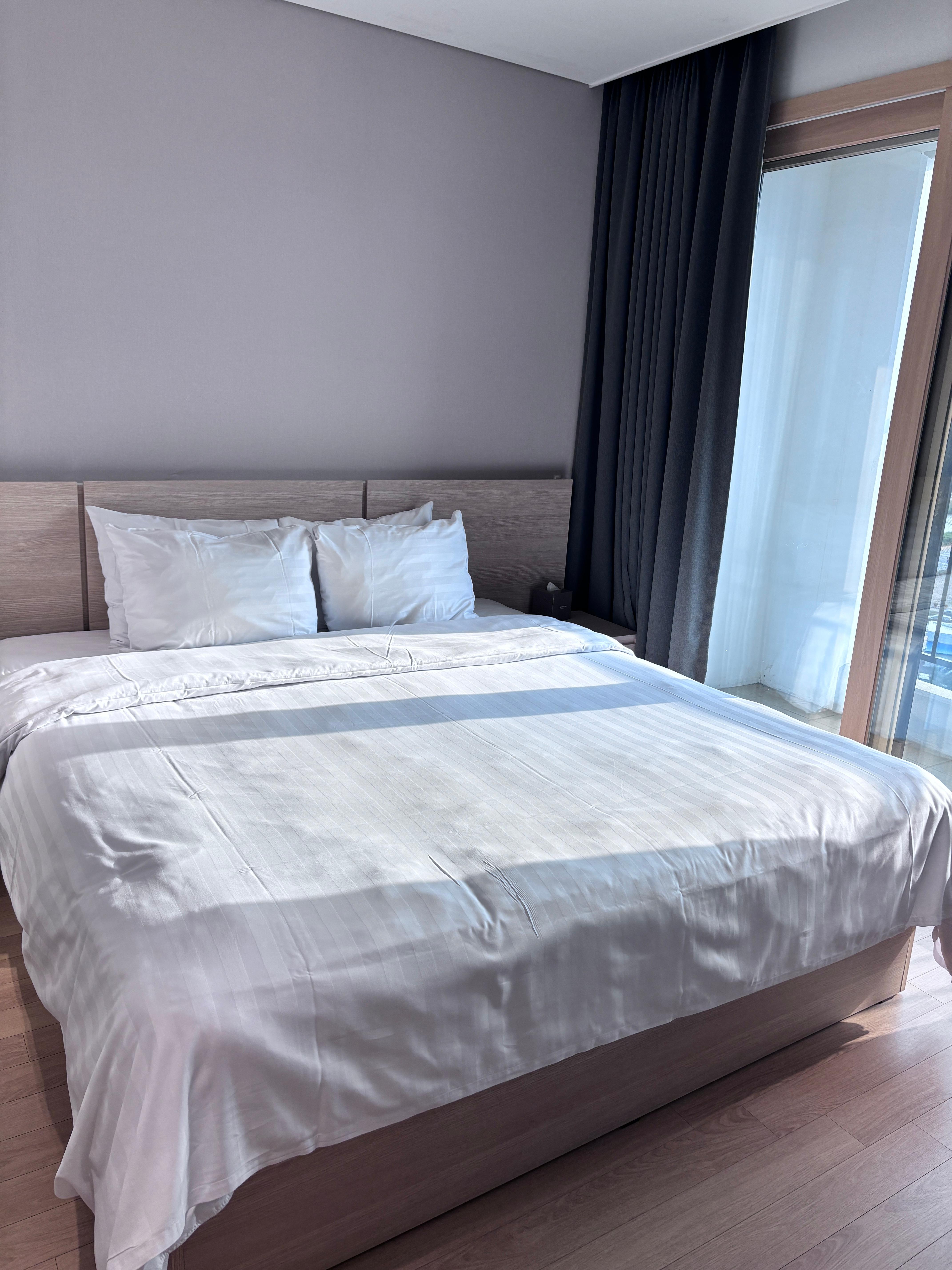 더블침대 있고 베란다가 있습니다. 빨래 건조대도 있어서 물놀이 하고 널어놓기 좋아요. 방에 세탁기와 빨래건조대가 있어서 저희는 최소한으로 준비해간 옷을 빨아입었습니다. 물놀이도 아침에 하고 점심 먹기 전에 널어놓고 마른 수영복 입고 저녁에 또 하고요.