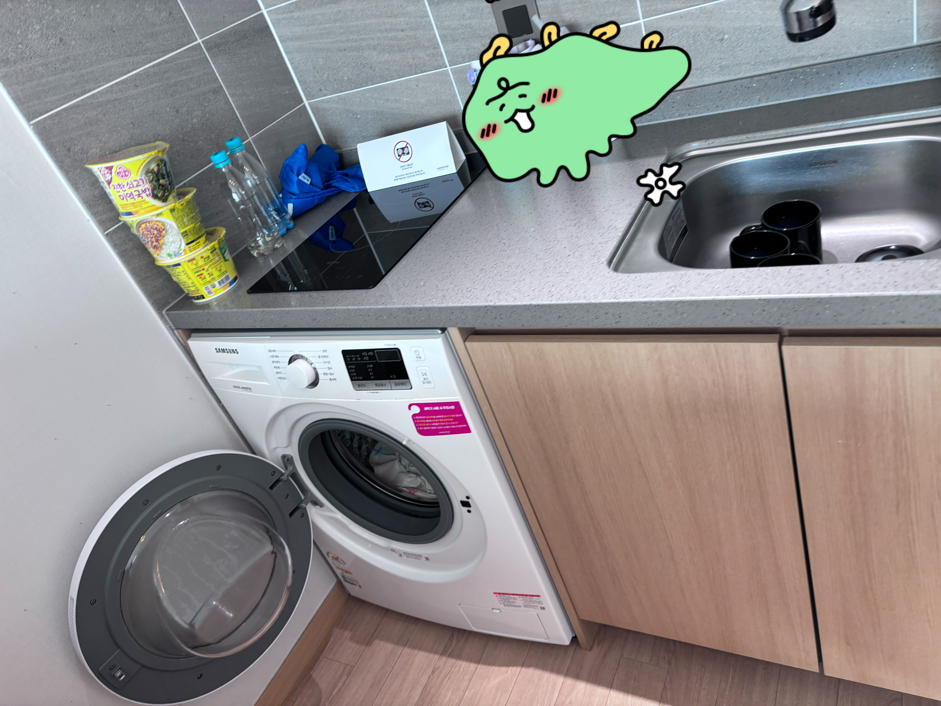 세탁세제는 1회분이 제공됩니다. 그래서 저는 집에서 쓰는 섬유유연제와 세탁세제를 따로 챙겨왔어요. 다 마신 탄산수 병이 있길레 거기에 조금씩 담아왔더니 좋더라고요. 세탁기 사이즈는 꼬망스 정도 였어요. 급수가 좀 늦긴 하지만 방 안에 있으니 너무 편하고 좋았어요.