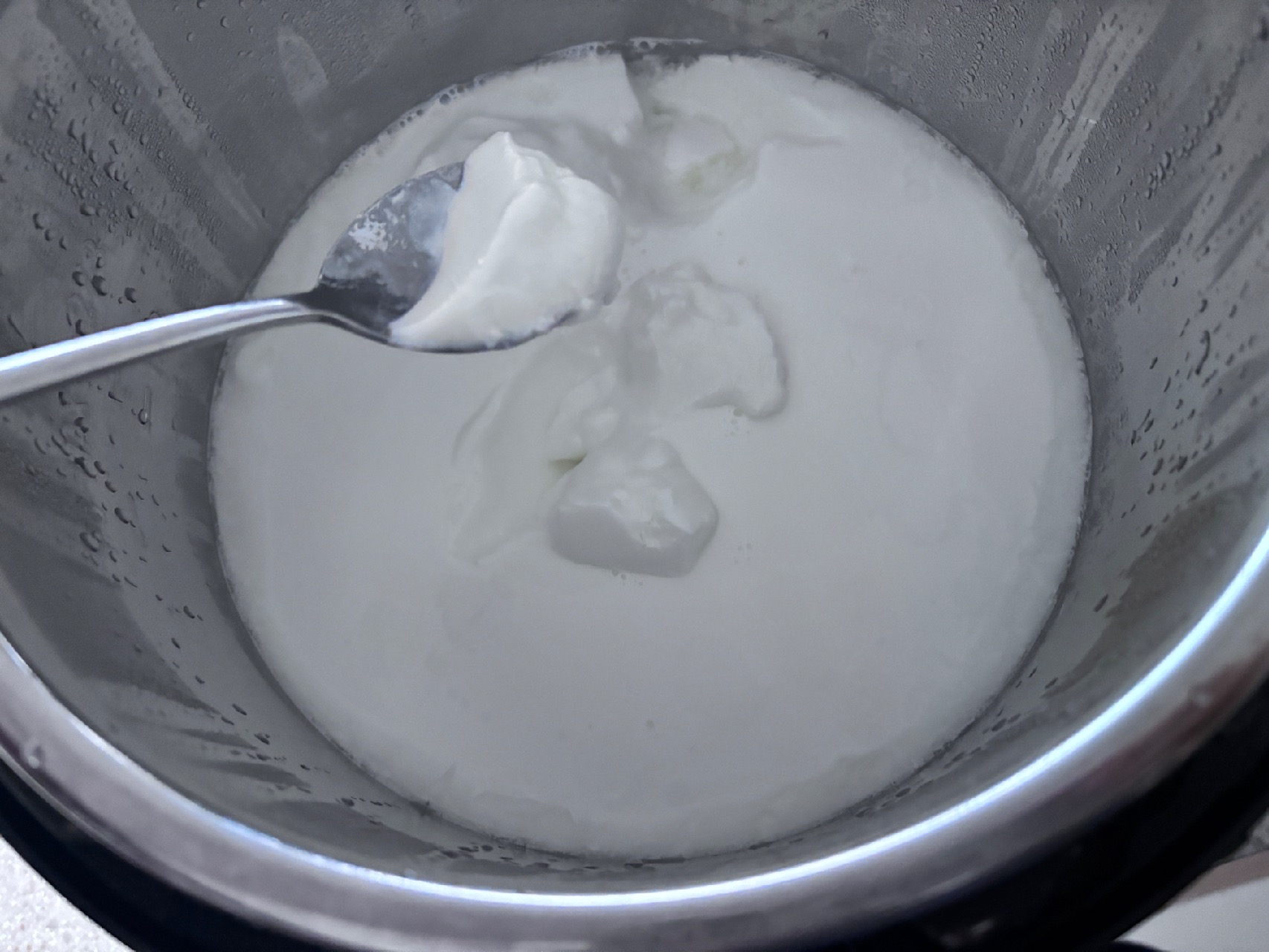 보일모드 끈 후 요거트 스타터 섞어서 요거트 모드를 다시 눌러줍니다. 저온으로 하면 발효가 천천히 되기 때문에 노멀모드로 해주었어요. 저번에 그릭베어스 스타터를 저온으로 돌린 것과 맛이 어떻게 달라졌을지 궁금합니다. 이제 할일이 끝났어요. 시간이 발효의 마법을 부려줄거예요.