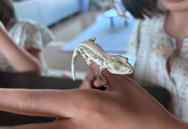 그런데 이년 전 송현아 교보문구 앞에서 크레스티드게코, 일명 속눈썹 도마뱀을 분양하는 것을 보았다. 생각보다 도마뱀이 너무 예쁘고 귀여웠다. 겁쟁이 아이들의 반응도 나쁘지 않았다. 크레스티드게코는 똥도 별로 안 싸고 밥도 주 2~3회만 먹는데 수명이 10~15년이라고 했다. 그러나 갑자기 입양을 결정하기엔 너무 무책임한 일인 것 같았다. 도마뱀은 반려동물 후보에 전혀 없었기 때문이다. 그래서 그날의 속눈썹 도마뱀의 깜찍한 모습을 수일간 곱씹으며 도마뱀을 키워보고 싶다고 노래를 불렀지만 서서히 잊혀 갔다.