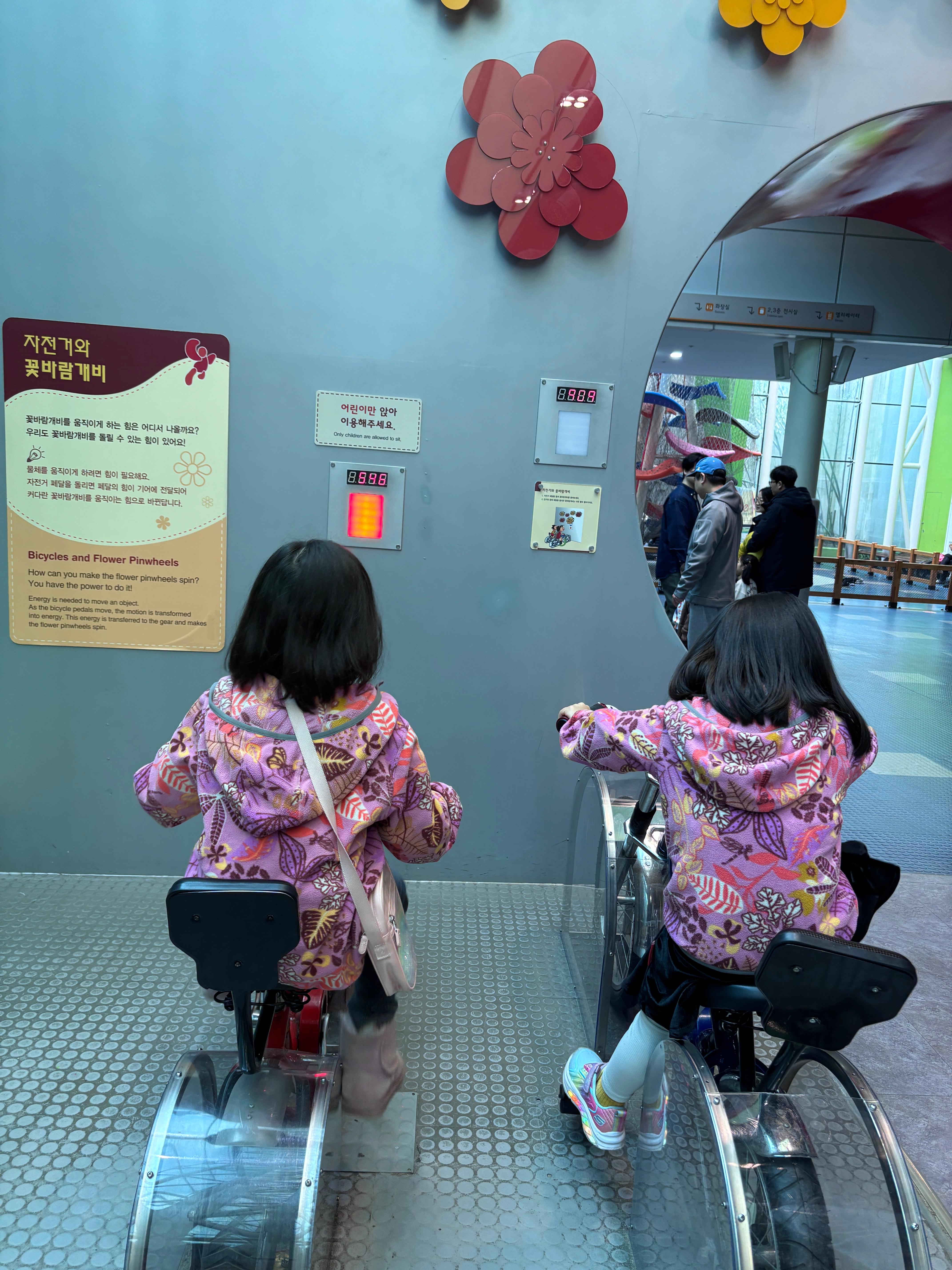 1층 전시실부터 둘러봅니다. 영유아들만 입장이 가능한 놀이공간이 있어요. 저희 아이들은 영유아가 아니기 때문에 패스하고 안쪽에 있는 운동에너지를 이용해보는 체험을 했습니다. 자전거 패달 밟아 바람개비를 돌리는 활동도 있고 펌프질해서 공을 높이 띄워보는 활동도 있어요.