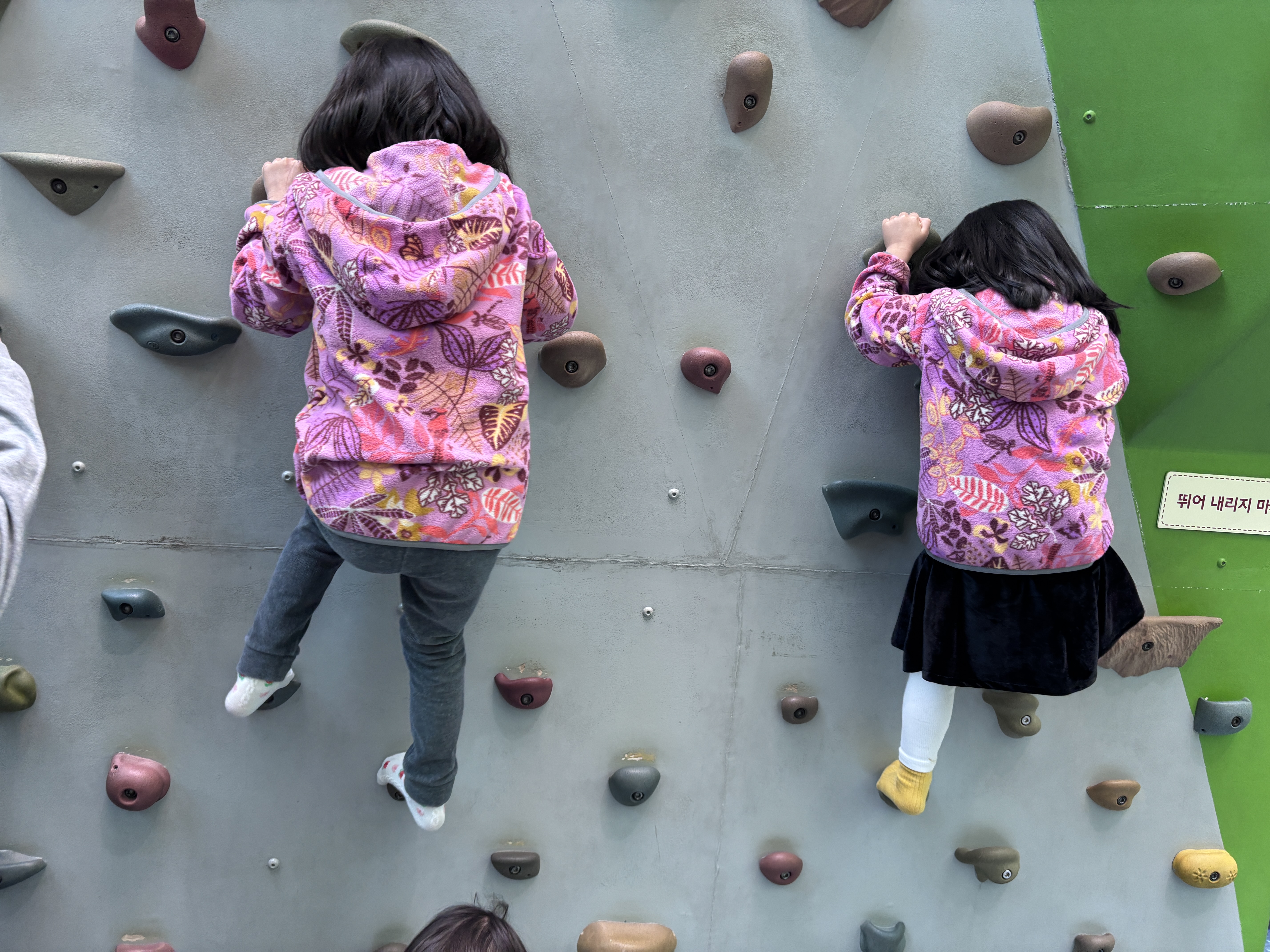 그리고 가장 좋아했던건 클라이밍입니다. 암벽타기 하면서 한참을 놀았던 것 같아요. 암벽타기는 잭과콩나무 조형물 뒷쪽에 있어요. 잭과콩나무 수업이 없는 시간에는 암벽타기를 자유롭게 이용할 수 있습니다. 밑에 폭신한 폼이 깔려있긴 하지만 아무래도 오르던 아이들이 떨어지면서 밑에 지나가다가 다치는 일도 왕왕 생기더라고요. 다칠 수 있으니 아이들 잘 보셔야 할 것 같아요.