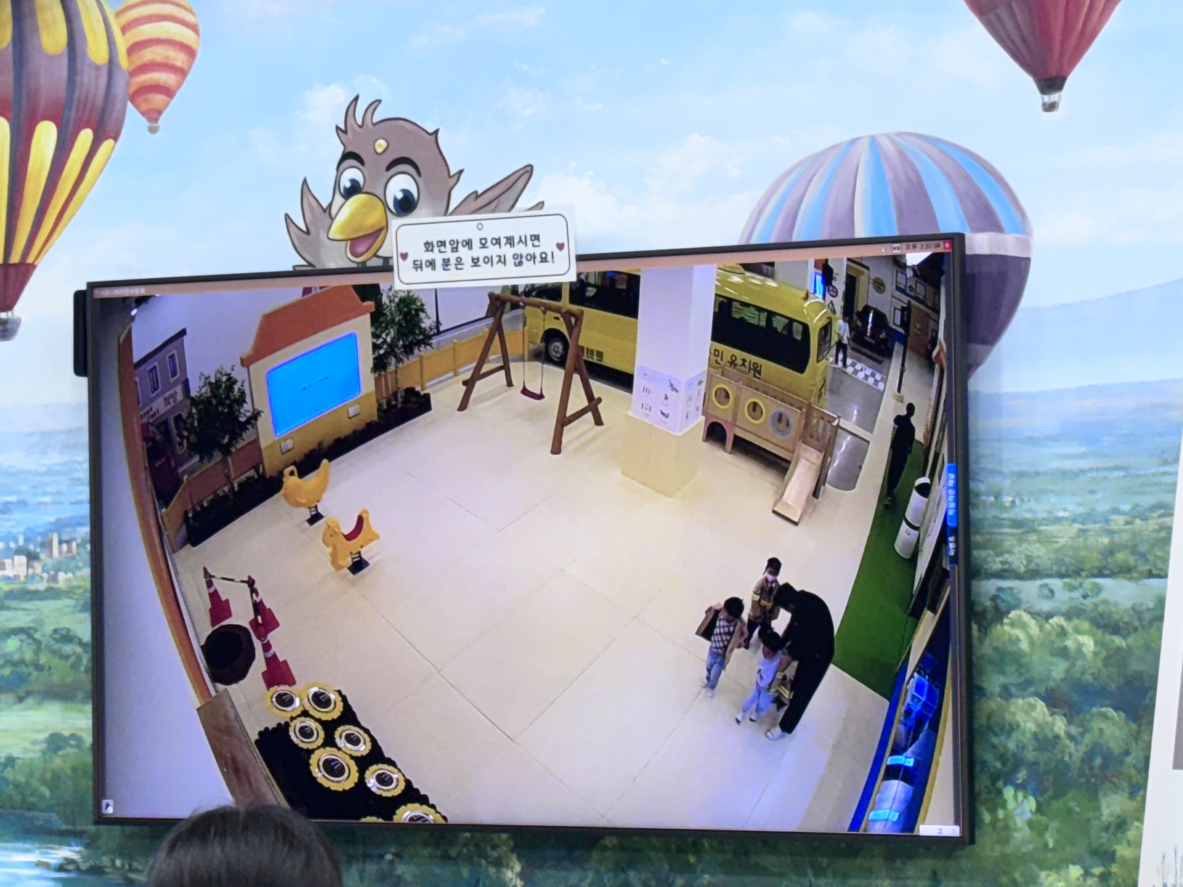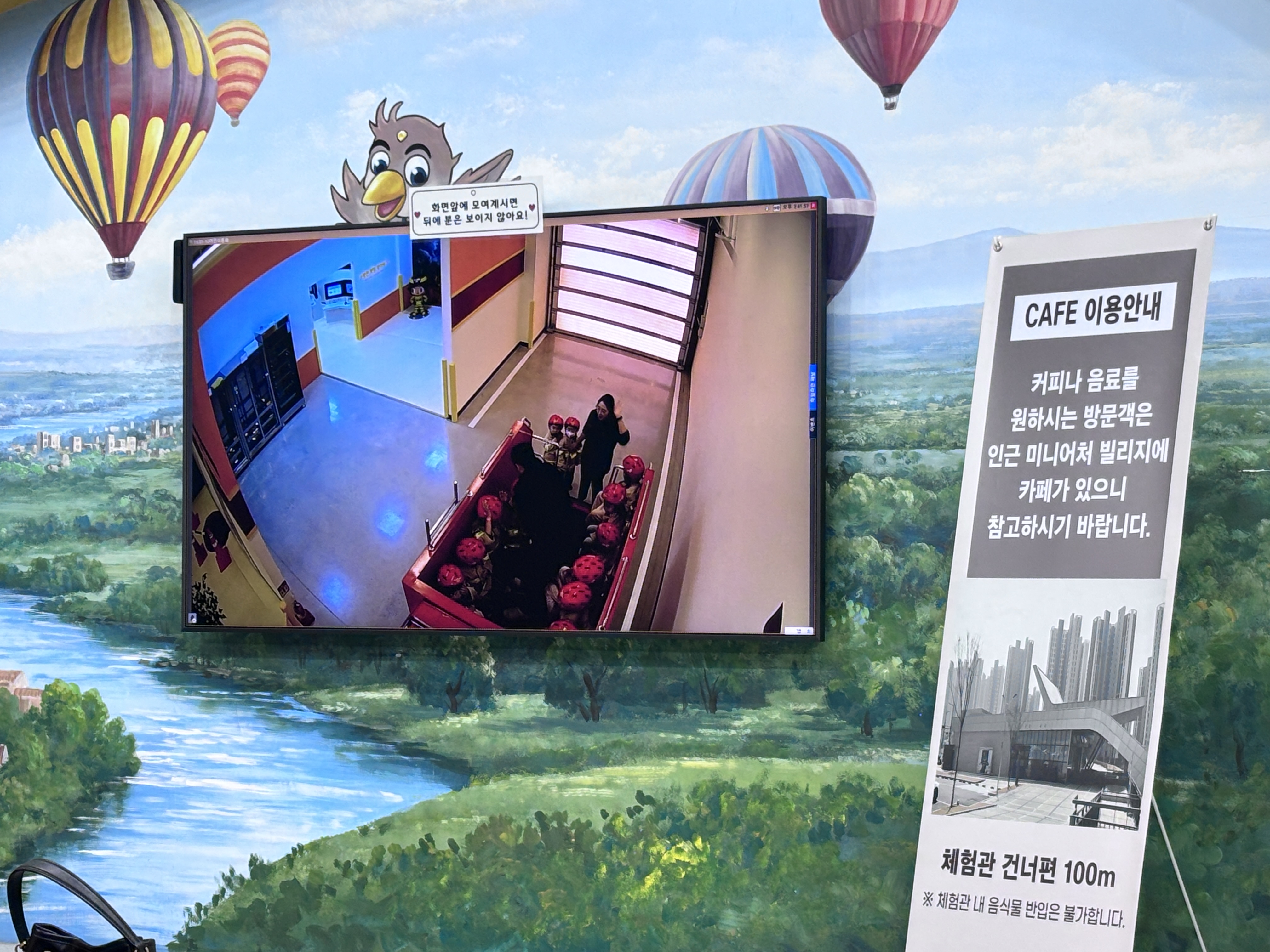 안전동화마을 입장시간이 되면 아이들만 줄을 서서 안으로 입장합니다. 그리고 1시간 정도 안에서 안전체험을 하게 되요. 2팀으로 나눠서 체험하더라고요. 부모님들은 대기하면서 벽에 걸려있는 모니터로 아이들이 잘 참여하고 있나 확인하실 수 있어요.