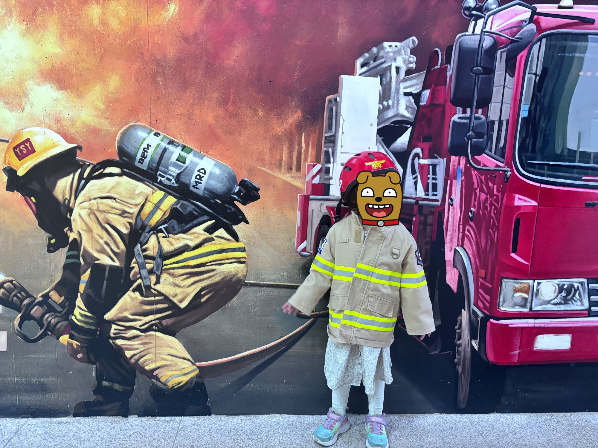 조금 일찍 도착해 소방관 옷을 입고 기념사진을 찍어보았습니다. 안전동화마을쪽이라 소방관 옷이 딱 유치원생들 몸에 맞는 크기네요.