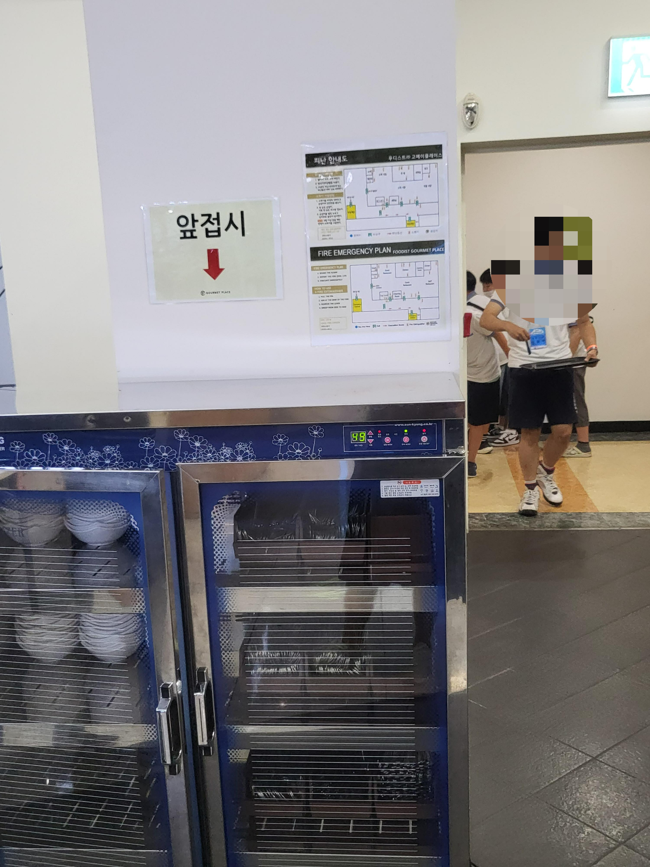 푸드코트안에 아이들 손을 씻는 곳이 있어서 좋아요. 처음에 왔을때 못보고 자연사관쪽에 있는 화장실까지 열심히 걸어서 다녀왔었는데 밥 다먹고 나가는 길에 손씻는 곳을 발견했던 기억이 납니다. 왼쪽 사진에 있는 하이체어 옆이 손닦는 곳이에요. 냅킨으로 간단하게 입을 닦을 수 있는 공간도 있으니 편하게 이용하시길 바랍니다. 오른쪽 사진은 앞접시와 포크, 수저 등이 있는 소독기가 있음을 알려드리고 싶어서요. 저희는 음식 받으면서 식당앞에 있는 포크를 들고 와서 먹었는데 소독기 안에 있는 것이 아무래도 더 위생적이지 않을까 합니다. 소독기 뒷편으로는 정수기가 있어요.
