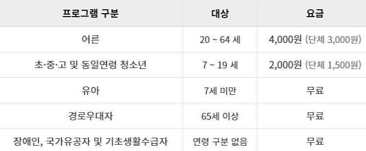 관람시간 오전 09:30 ~ 오후 5:30 *발권마감: 오후 4:30 (정기 휴관) 매주 월요일(1.23, 10.9, 12.25 제외), 신정(1.1), 설날(1.22), 추석(9.29) (대체 휴관) 설 연휴 다음 날(1.25), 한글날 다음 날(10.10), 성탄절 다음 날(12.26) ※ 월요일이 「관공서의 공휴일에 관한 규정」 또는 「국경일에 관한 법」상 공휴일인 경우에는 다음의 첫 평일을 대체 휴관