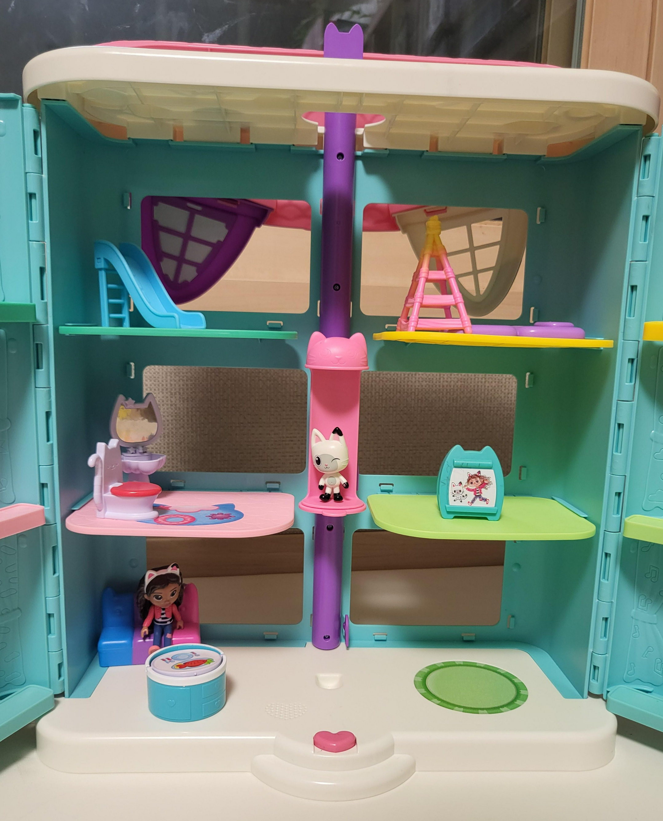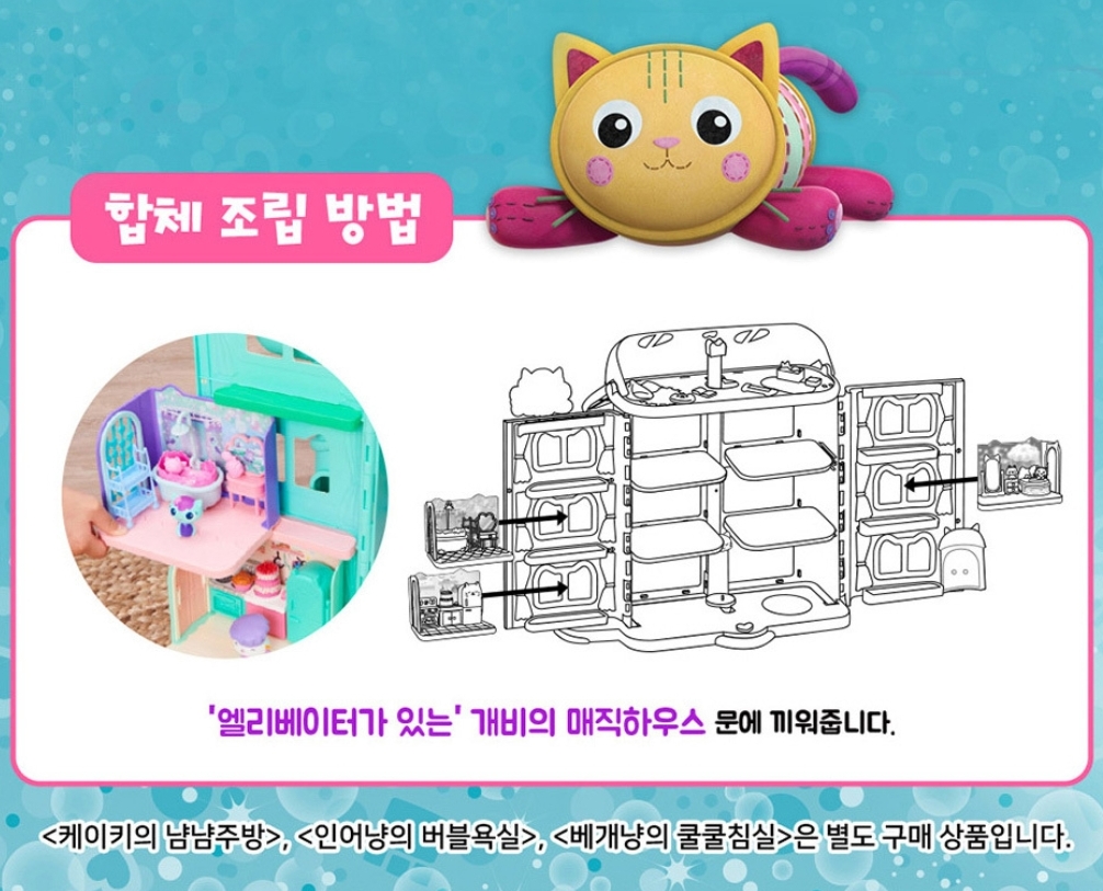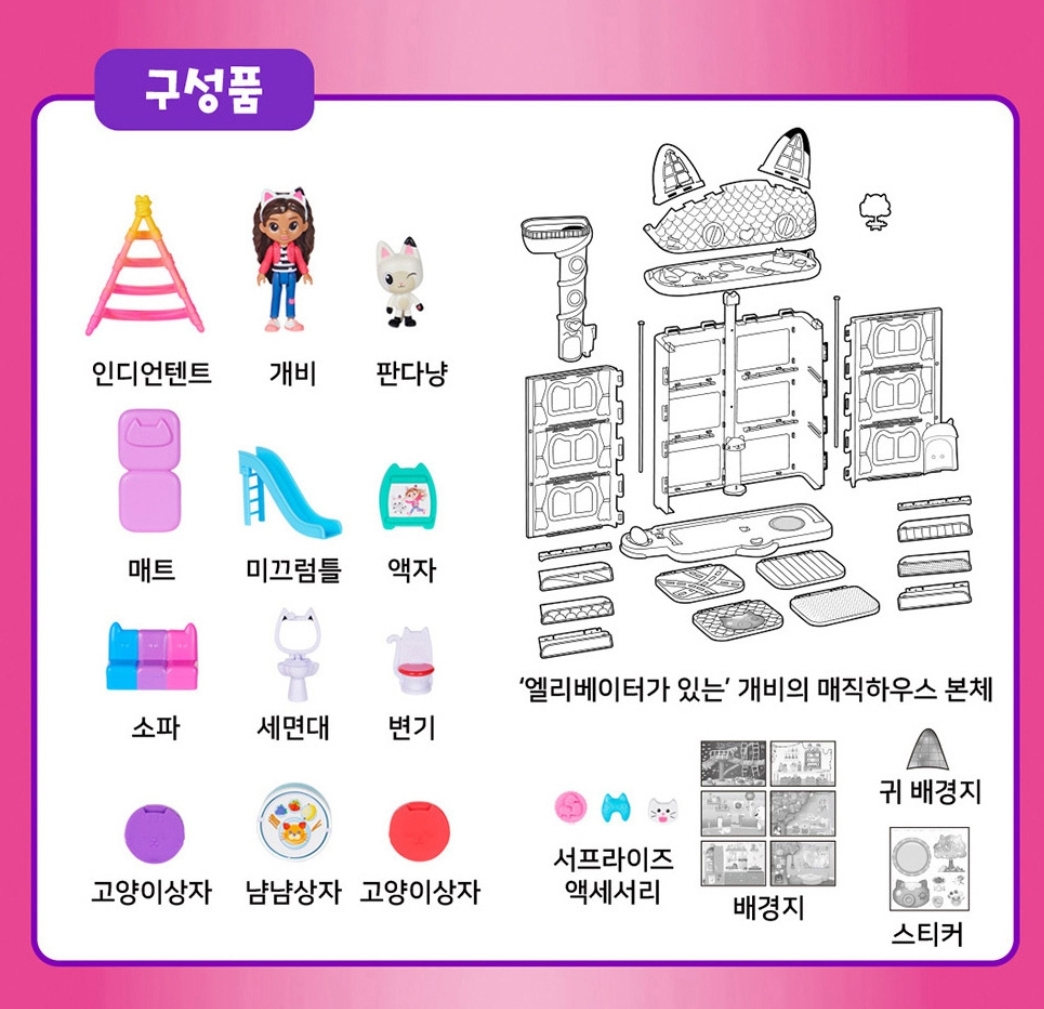 개비의 매직하우스에는 기본적으로 개비 인형 하나, 판다냥 하나의 피규어가 들어 있습니다. 커다란 개비의 하우스는 총 4층으로 구성이 되어 있는데요. 각각 공간에서 같이 가지고 놀 수 있는 소품도 몇 가지 들어 있어요. 이를테면 세면대, 변기통, 미끄럼틀, 텐트, 매트, 고양이상자, 식탁 정도가 되겠네요. 개비의 매직하우스 역시 다른 장난감들처럼 별도의 상품을 구입하면 개비의 매직하우스 문 쪽에 추가로 설치하여 플레이할 수 있도록 구성이 되어 있습니다.