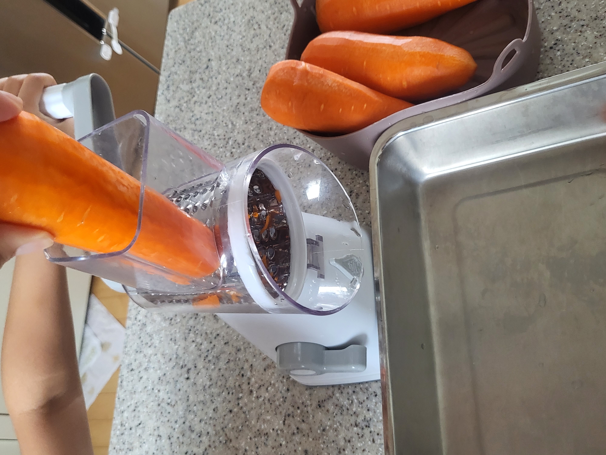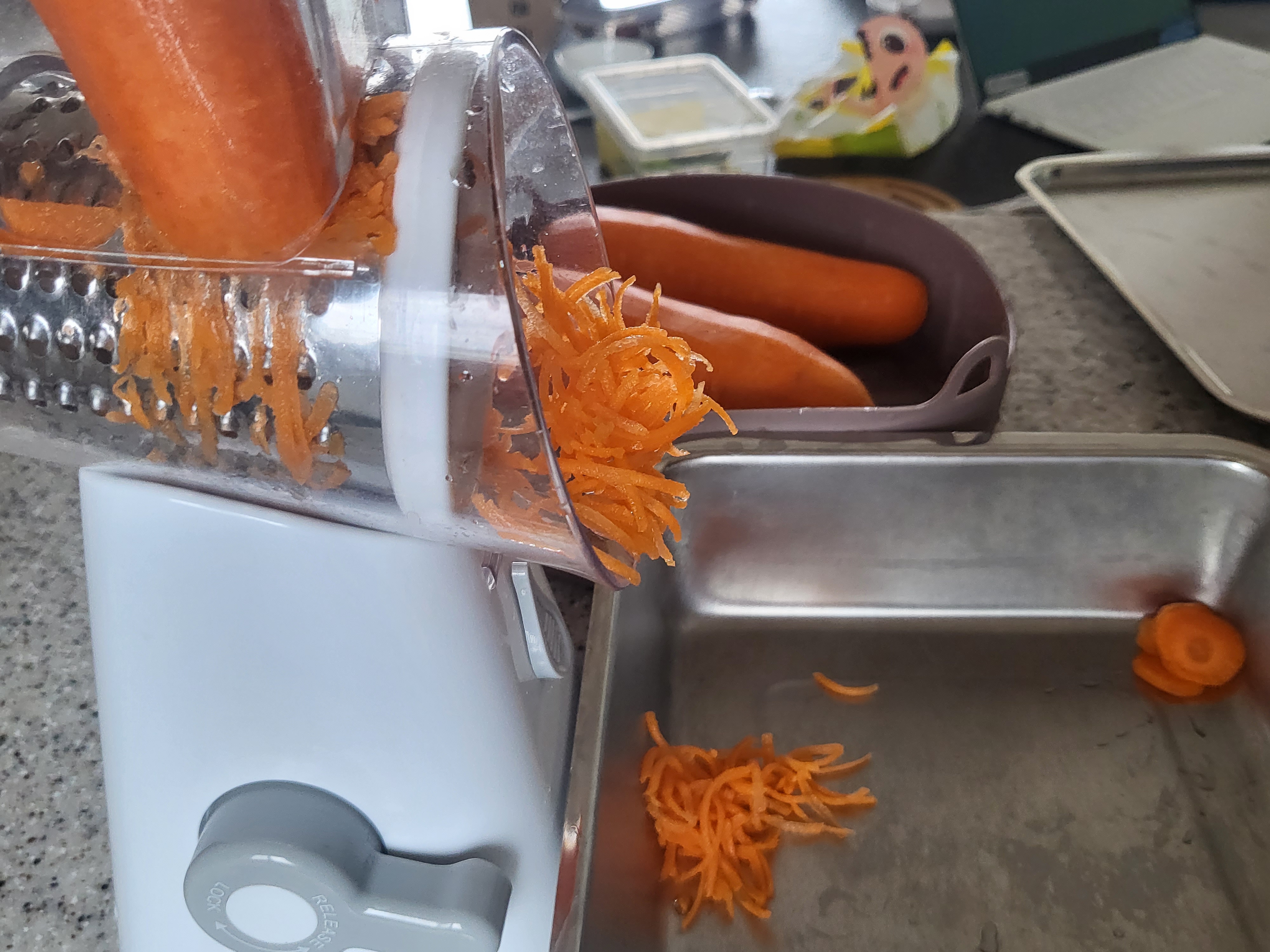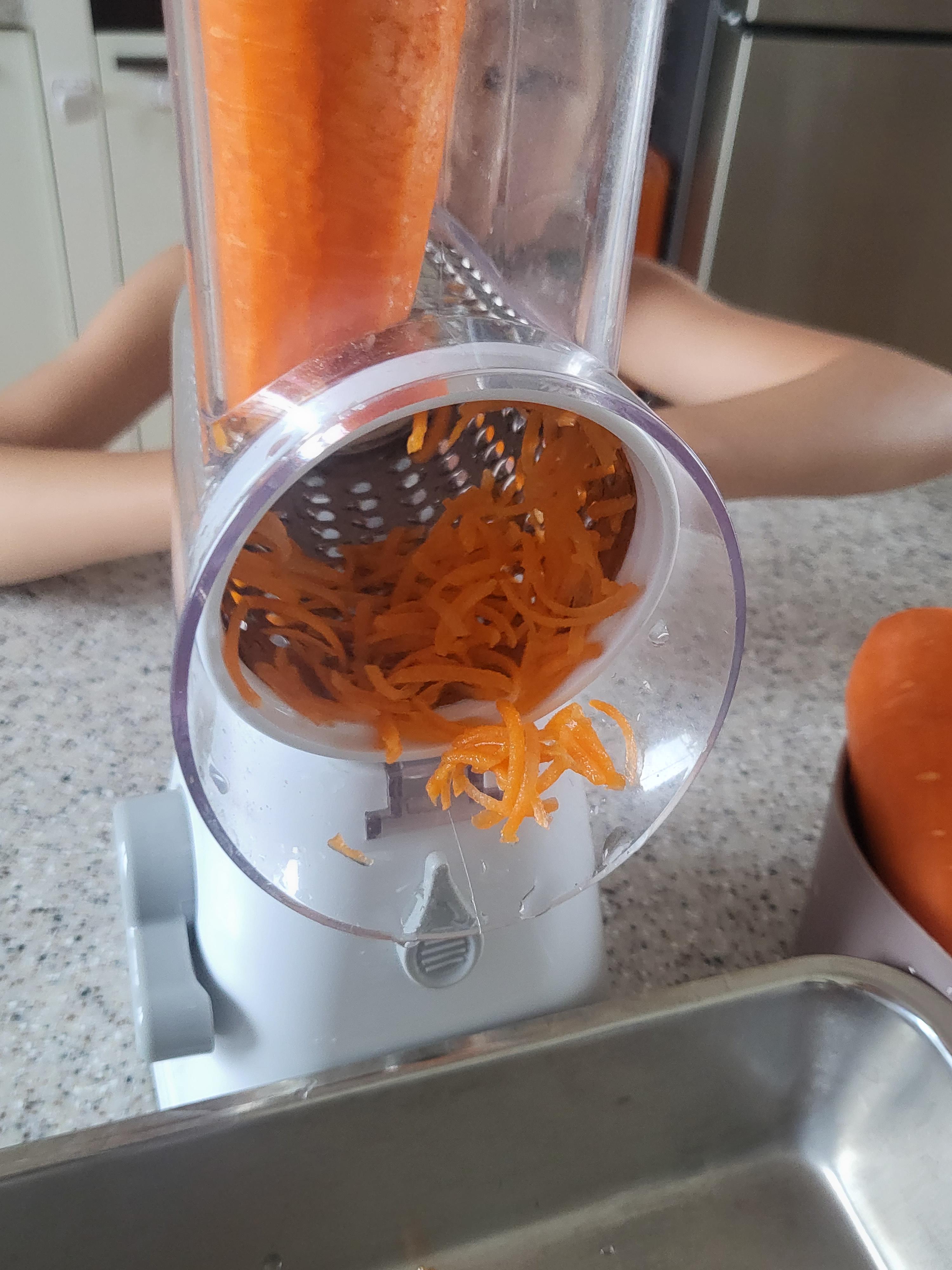 집에 곰돌이 채칼도 있었는데 두어번 손을 다쳤더니 채칼 스타일은 너무 무섭더라고요. 그래서 요즘엔 통돌이로 당근을 채치고 있어요. 아이들 어릴때는 다지기로 다져서 사용하기도 했는데 조금 크니 굳이 다질 필요가 없더라고요. 어차피 얇게 채를 치니 저 상태로 볶음밥에 넣어도 괜찮아요. 작게 다진 것이 필요하면 얼려놓은 당근을 그때그때 다져서 사용하면 되기 떄문에 이렇게 채쳐서 보관하는게 좋습니다.