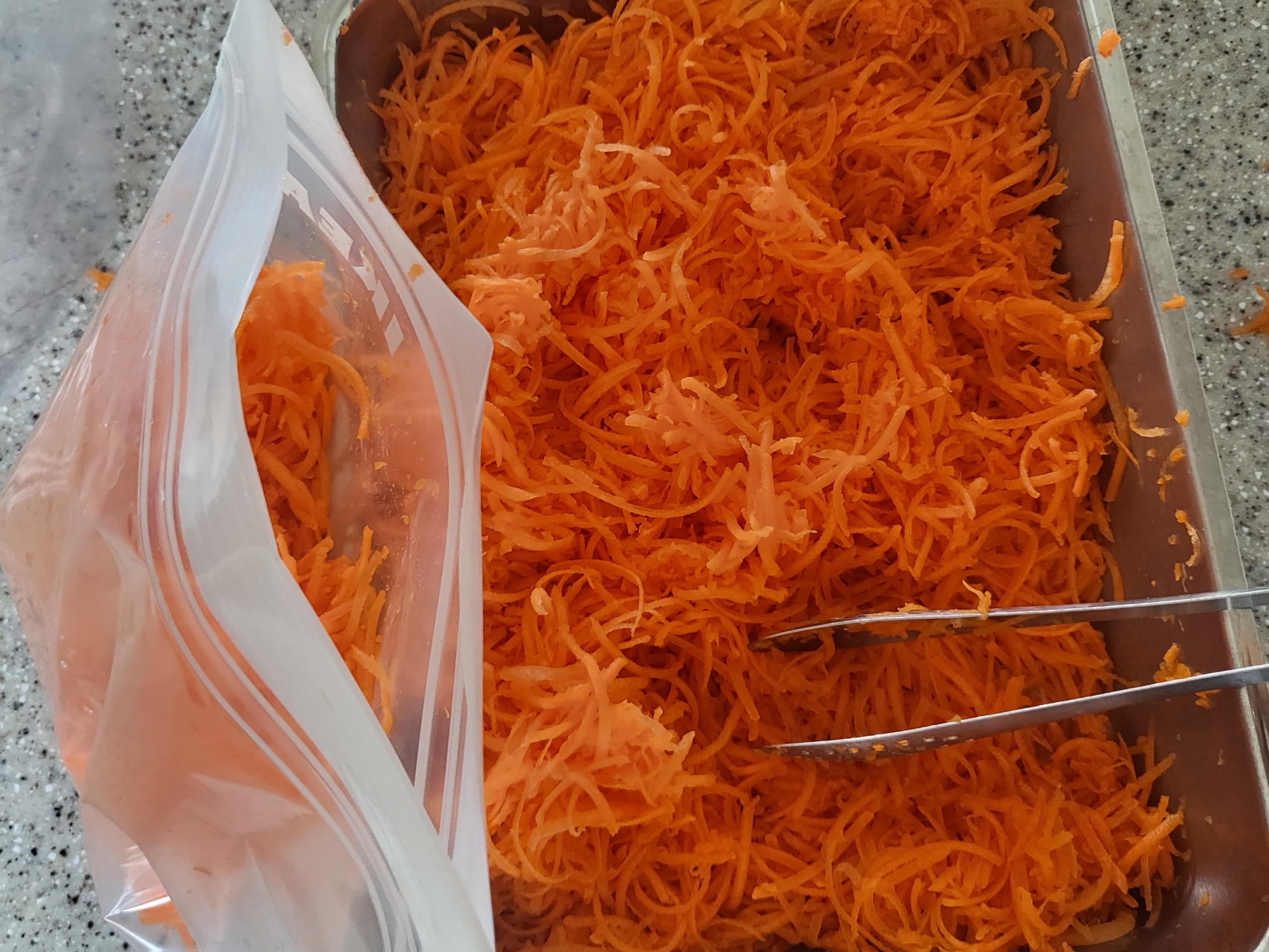 앞서 말씀드렸던대로 당근은 냉장보관을 하면 질산염이 나오는 채소이기 때문에 가족들의 건강을 위해 냉동보관을 하는 것을 권해드려요. 당근은 제법 단단한 식감을 갖고 있기 때문에 해동해도 실온에 보관헀던 당근과 큰 차이가 느껴지지 않습니다. 지퍼백에 담아 얇게 펴서 냉동시켜두면 요리할때마다 필요한 만큼 툭툭 잘라서 사용하기 좋아요.