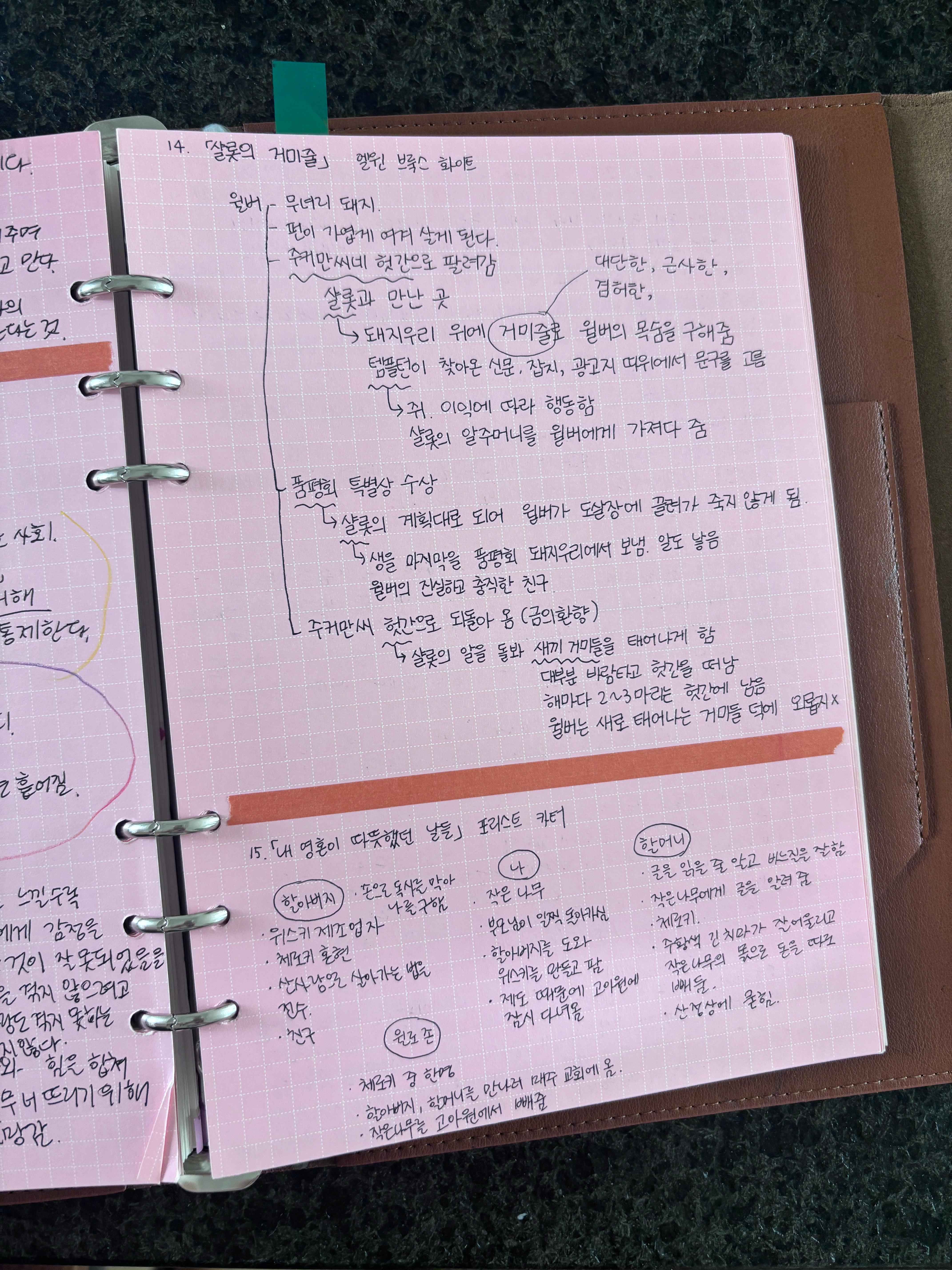 몇 권의 책을 그렇게 정리하다 보니 중요한 것을 놓치고 있다는 생각이 들었습니다. 내가 그 책을 읽으며 그 부분이 왜 감동적이게 느껴졌는지, 어떤 부분이 마음에 들었는지 나의 생각을 놓치고 있었던 것이었죠. 그래서 최근엔 읽으며 책에 나와있는 이야기 뿐만 아니라 제 머릿속에 떠돌아다니는 것도 함께 적기 시작했어요. 그랬더니 조금 더 읽었던 책이 저와 가까워진 것 같은 느낌이 들더라고요.