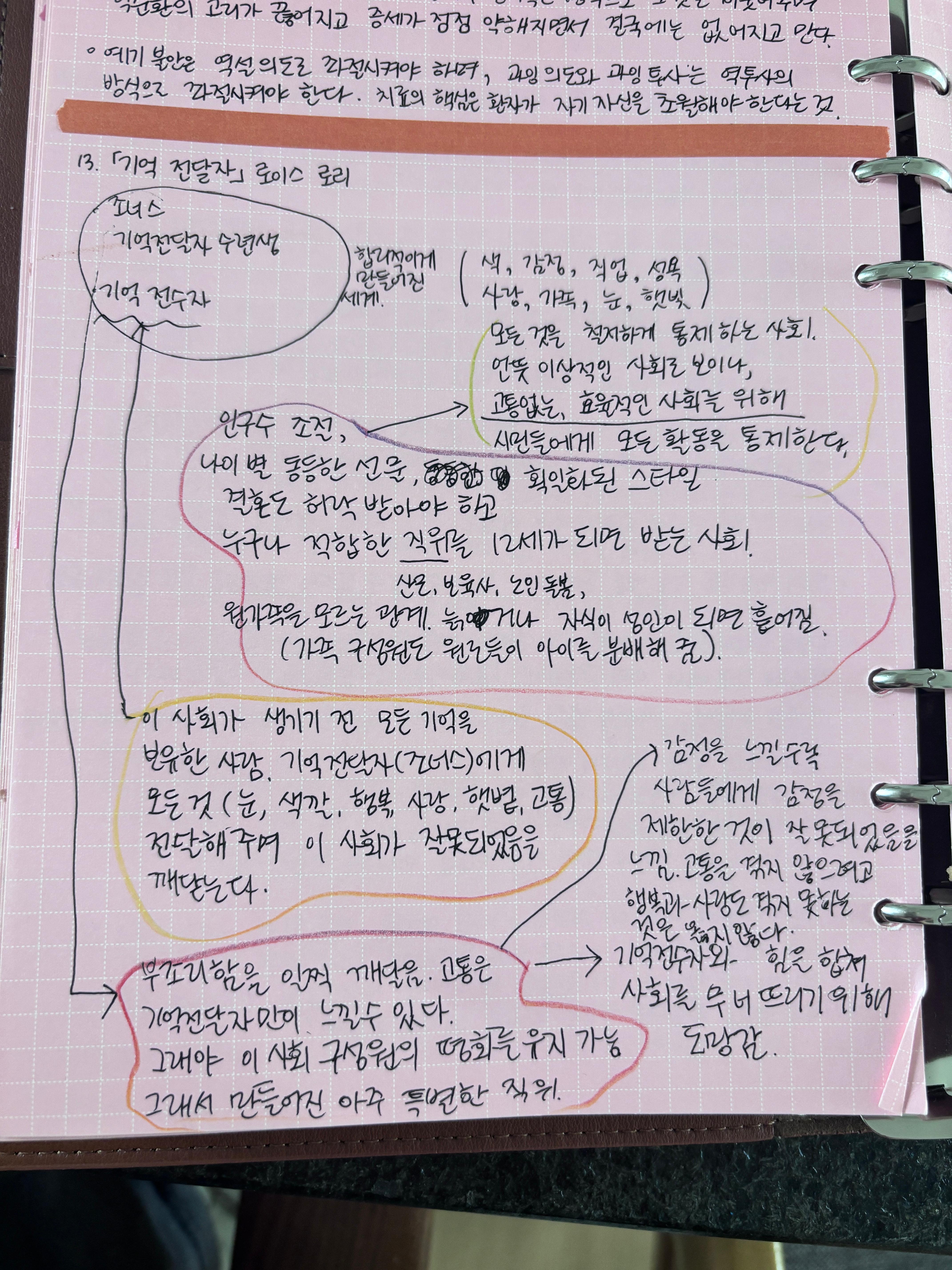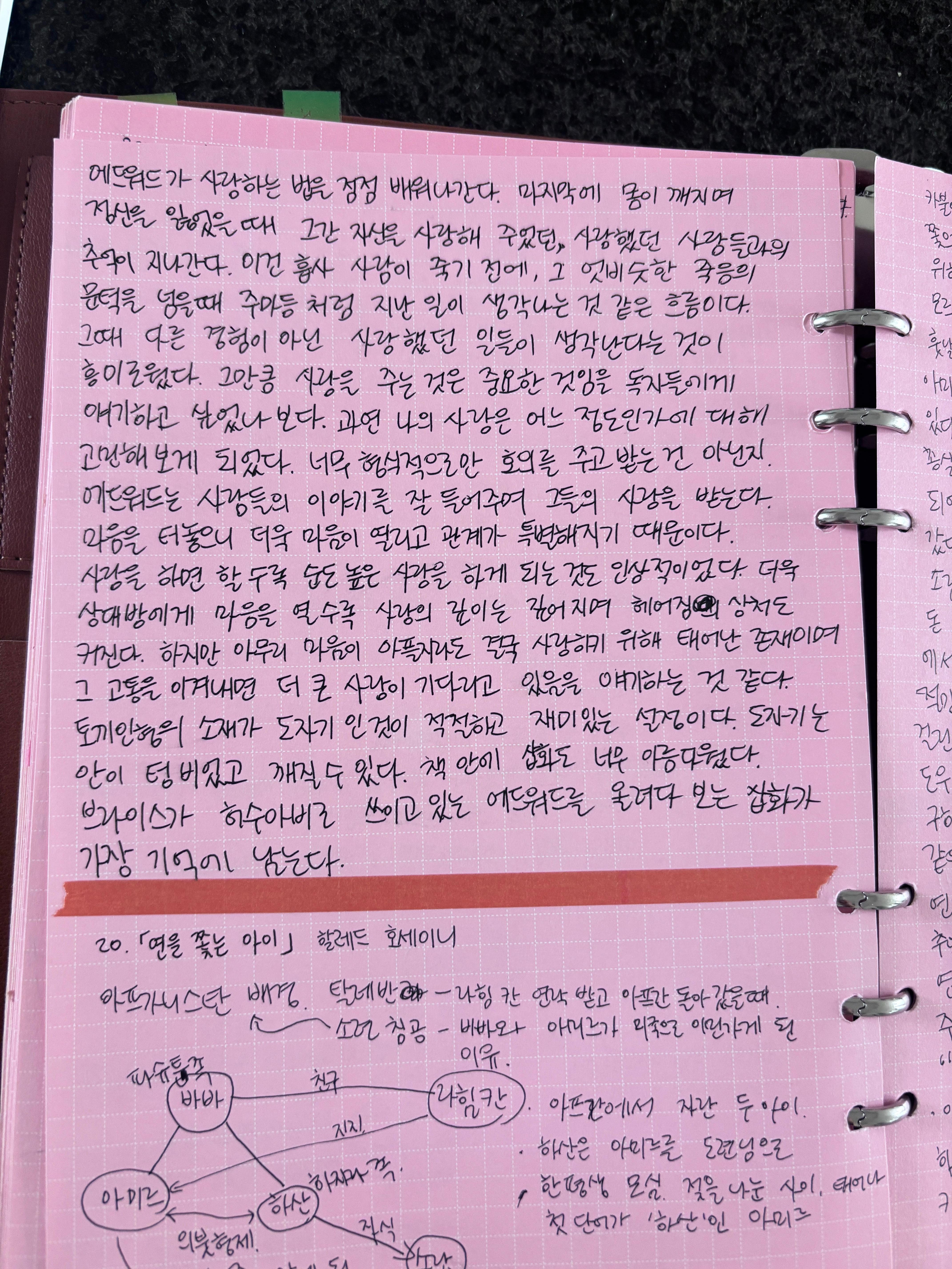 그러다 소설책같은 경우엔 등장하는 인물의 간략한 특징 같은 것도 함께 메모하면 좋겠다고 생각했어요. 그래서 엉망이지만 도식화(?)도 해보며 읽고 나서 생각나는대로 정리해 보았죠. 엉망이지만 누굴 보여주기 위함이 아닌 자신만의 기록이기 때문에 보고 책 내용이 떠오르면 장땡 아니겠어요?
