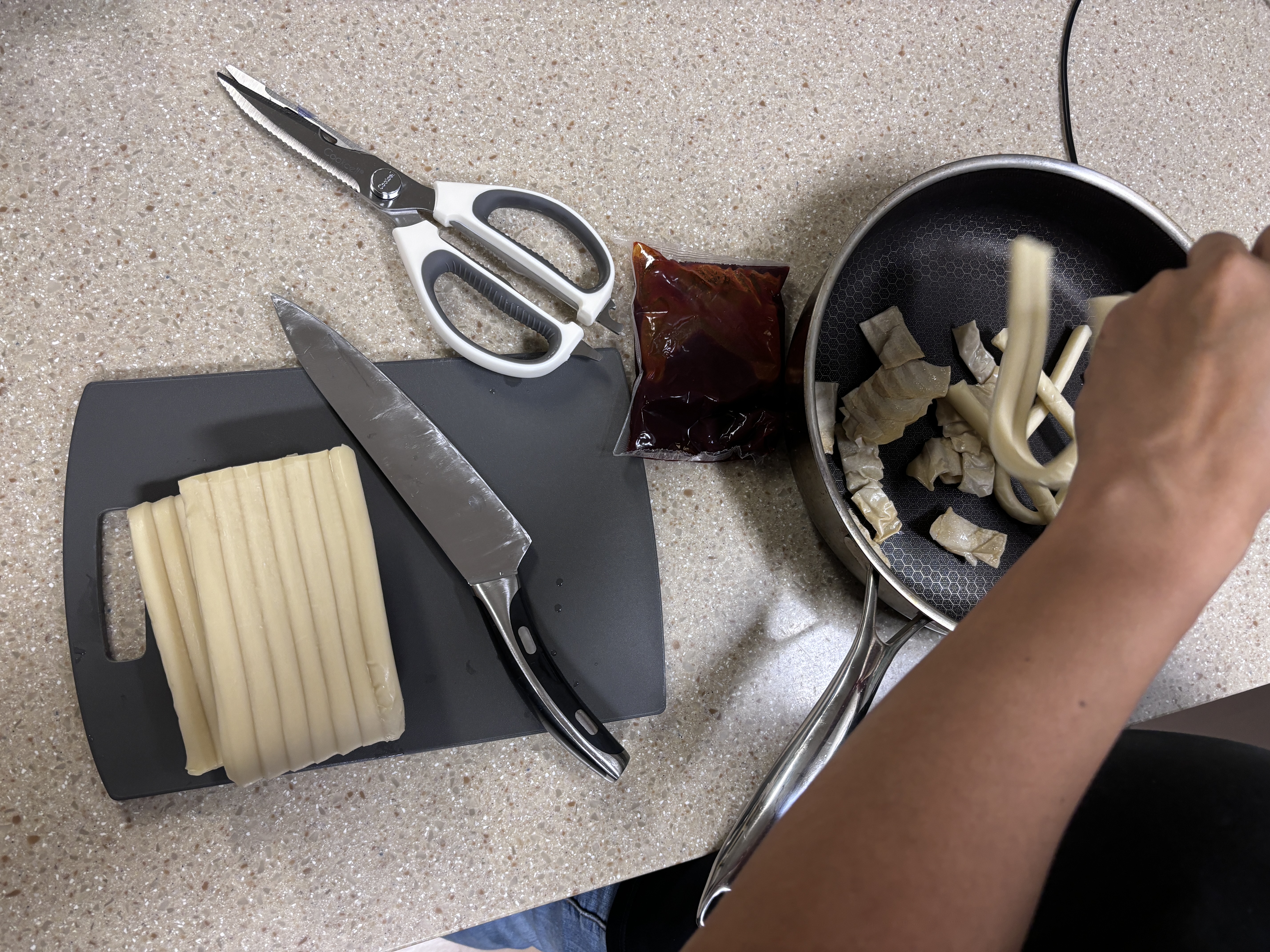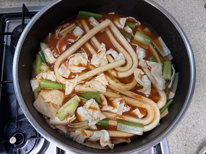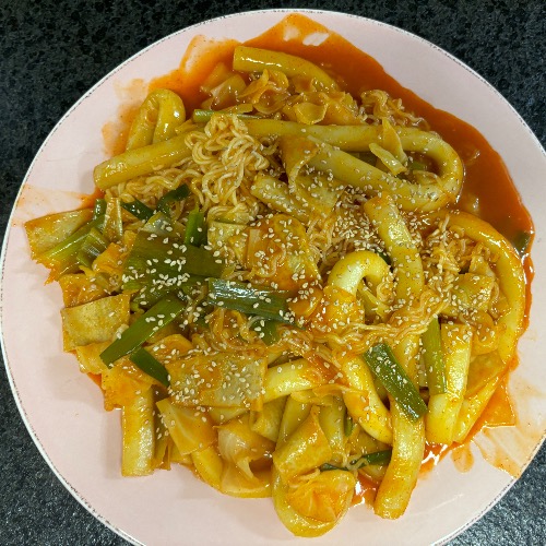 남동공단 떡볶이는 쫄깃하고 부들부들한 밀떡인데 면처럼 길어요. 반씩 나누어 먹는 저희는 떡 반, 동봉된 소스 반을 팬에 넣어줍니다. 그리고 파, 양배추를 꼭 추가로 넣어 먹어요. 아삭아삭 달큰한게 너무 맛있어요.