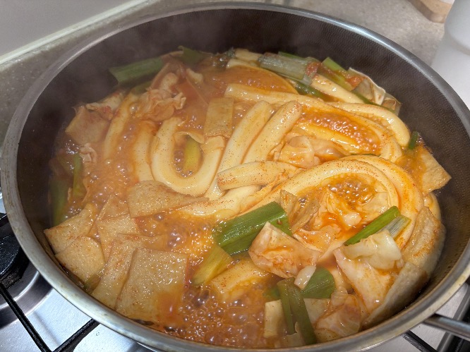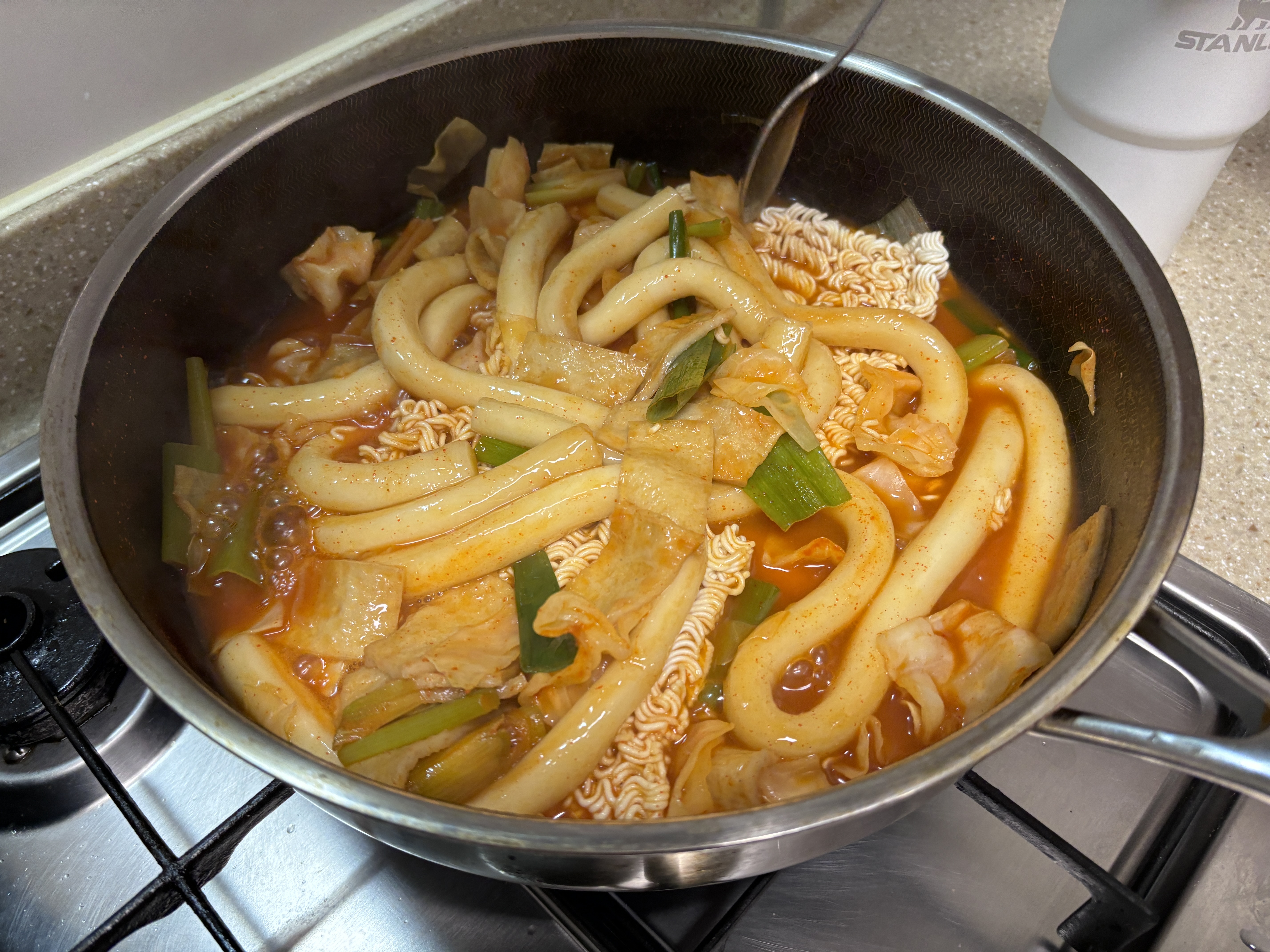 원래 3인분 모두 하려면 물 1리터를 넣어야 하지만 저희는 절반이기 때문에 물 550ml를 넣었어요. 그리고 바글바글 끓입니다. 끓이다가 떡이 부풀어 오르면 라면 사리를 넣어주었어요, 이번엔 집에서 아무도 손을 대지 않아 부식창고 자리만 5개월 넘게 차지하고 있던 마라 비빔면으로 했어요. 그리고 면이 익으면 조리 끝!