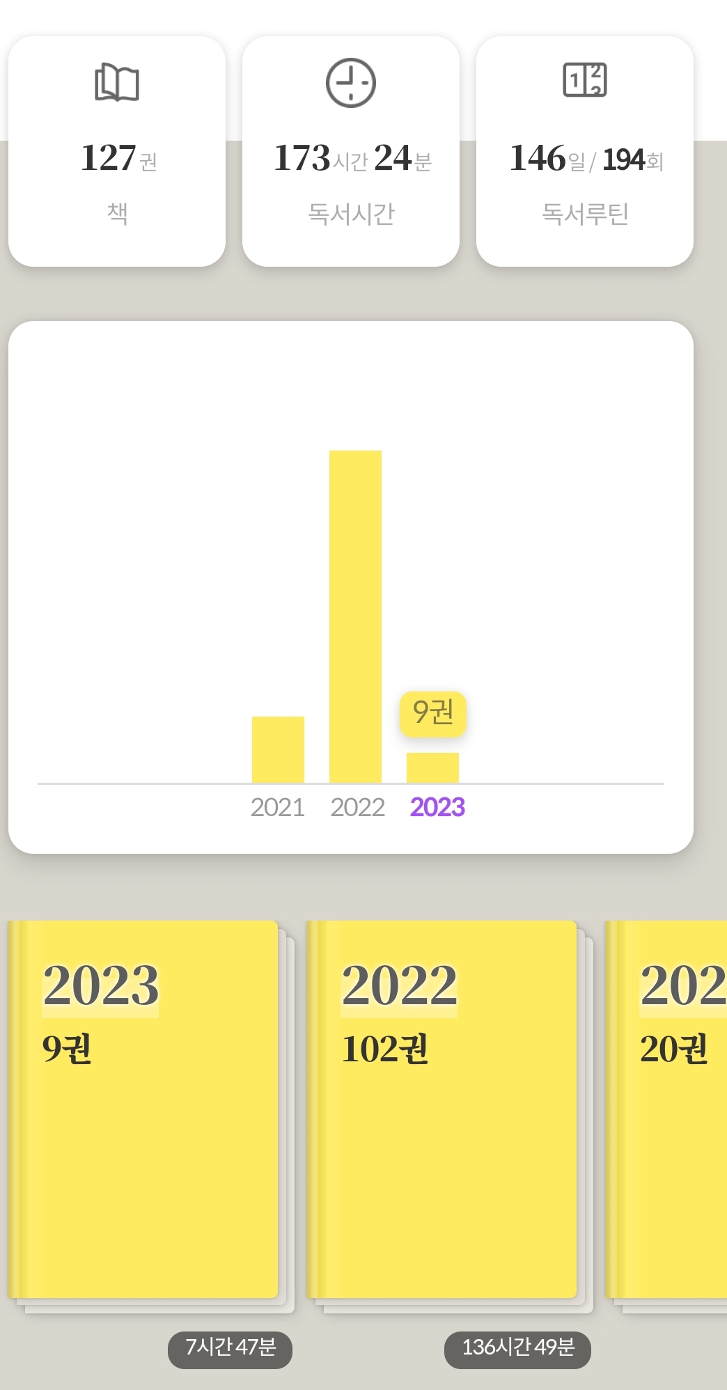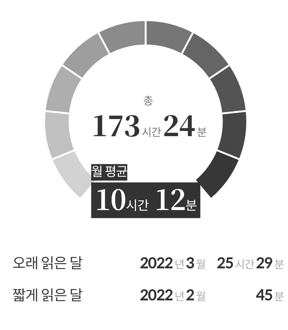밀리의서재에서는 연간, 월간, 전체 기간을 선택해 독서통계를 확인할 수 있어요. 그동안 내가 어떤 주제의 책을 보았는지, 독서량과 시간은 얼마나 되는지 깔끔하게 정리해서 보여줍니다.