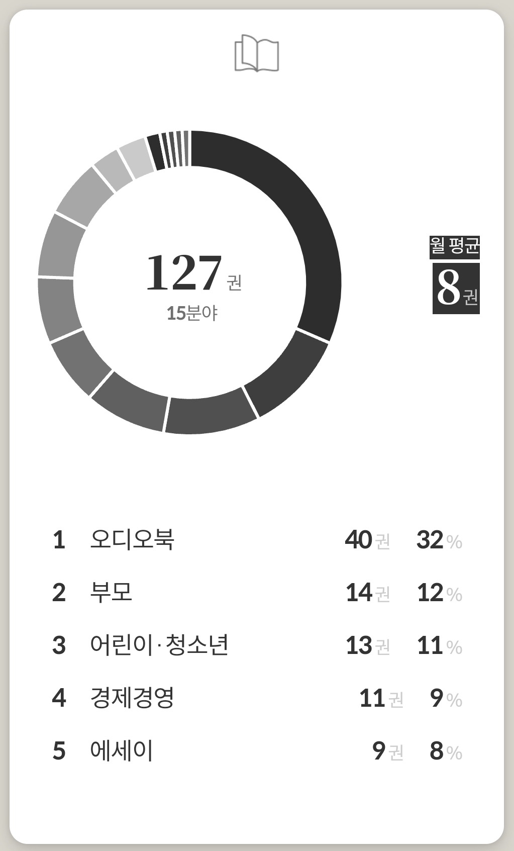 제 통계를 보니 오디오북이 압도적인 편입니다. 그리고 아무래도 아이를 키우다 보니 양육서를 많이 보았네요. 앞으로는 월간지와 소설도 골고루 봐주어 독서편식이 없도록 노력해야겠어요. 밀리의서재가 아니었다면 한달에 책 8권읽는 것은 많이 힘들었을 것 같아요. 애들 재우고 침대에서 자주 봐서요 ㅜ.ㅠ 종이책은 그렇게 못하잖아요..