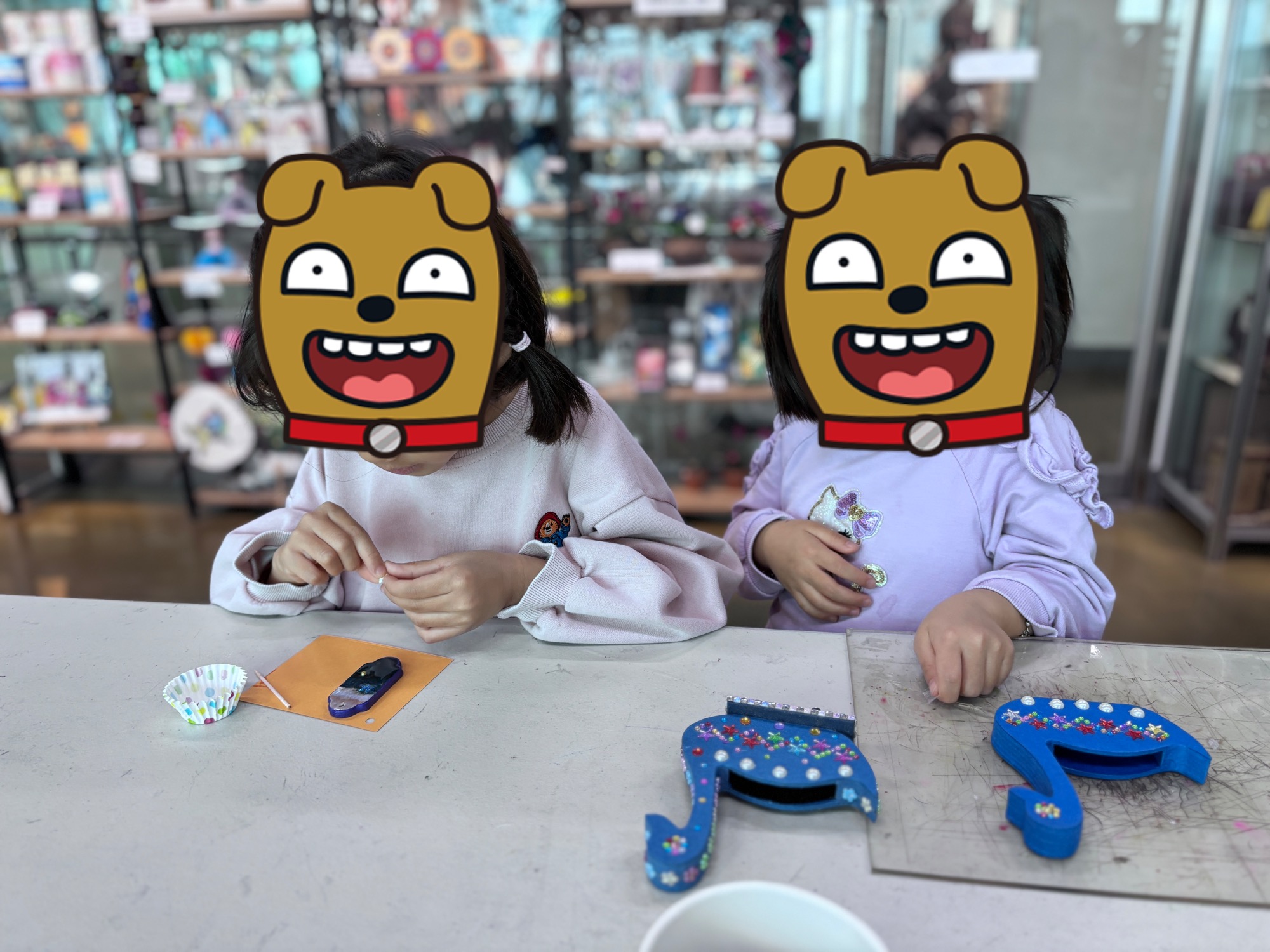 첫째는 한지로 만든 키링에 레진아트를 이용한 작품을 만들었어요. 집에서는 레진아트 가지고 놀게 해줬다가 뒷정리 지옥을 맛봤는데 여기는 선생님이 계시니 너무 좋더라고요. 지켜보는 제가 스트레스 받지 않고 레진아트 공예를 무사히 마무리 했습니다. 둘째는 아직 어려서 백조 메모꽂이를 만들어 보았어요. 종이로 된 메모꽂이를 보석스티커로 꾸며보는 간단한 체험이었습니다. 생각보다 체험비가 있어서 더 만들고 싶다고 말하는 아이들을 잘 구슬려 데리고 나왔어요.