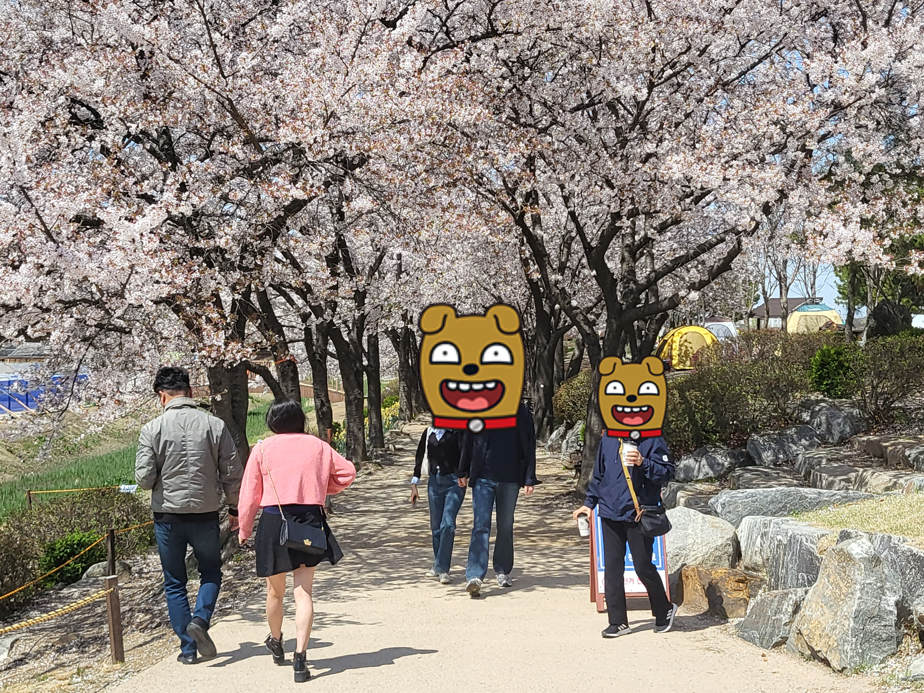 저희집 아이2, 제 동생아이 1과 함께 신나게 걸어봅니다. 여기 벚꽃길 사이드로 텐트 쳐져있는게 보이시나요? 조만간 팝업텐트라도 살것같아요.... 바람이 너무 불어서ㅠㅠ 돗자리 폈다가 고생했거든요. 돗자리에서 떨면서 김밥먹고 애들 비눗방울 좀 하다가 가만히 있음 추우니 움직이자고 돗자리를 접었어요ㅠㅠ
