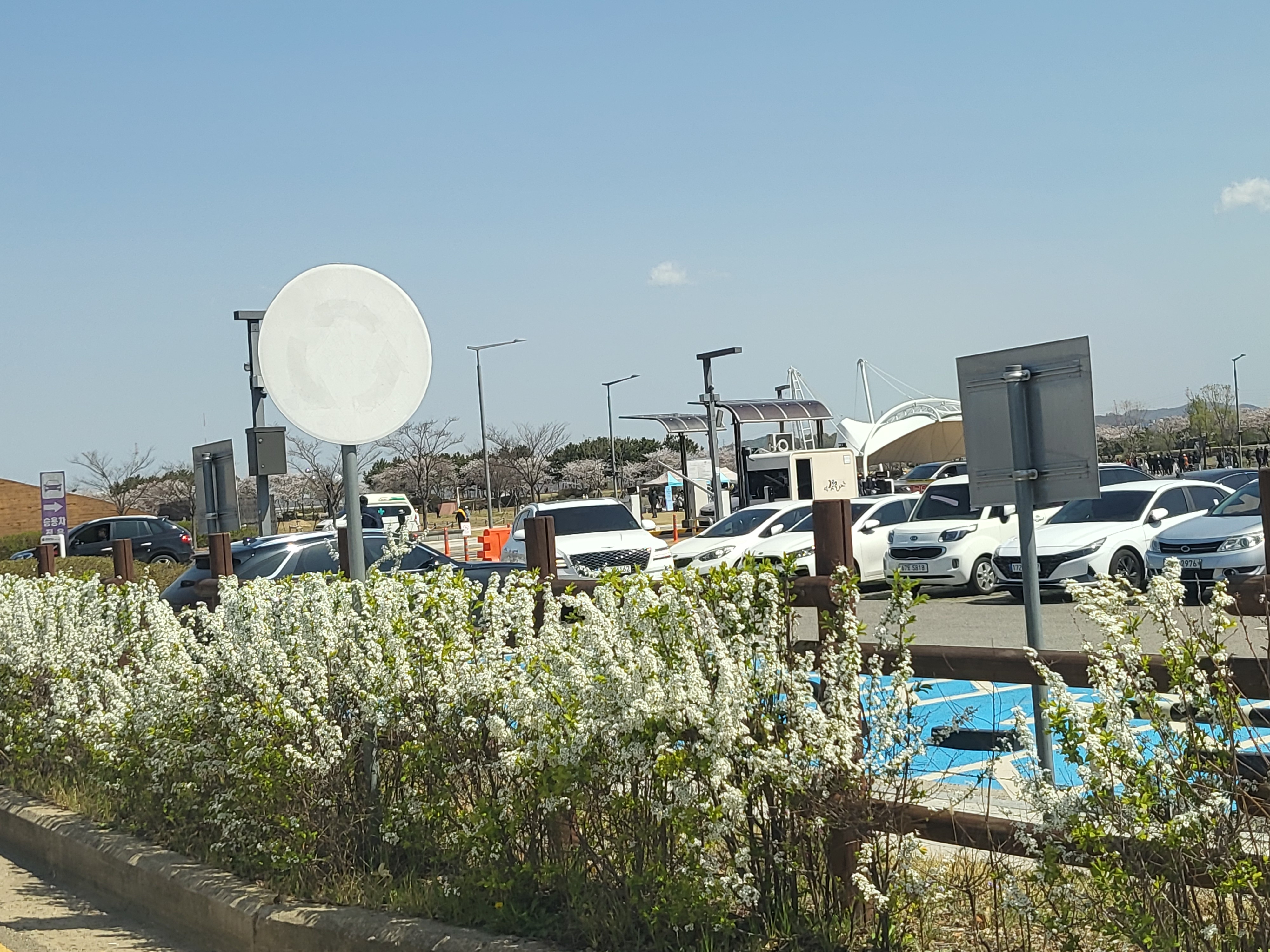 주차장도 꽤 넓은 편이에요. 주차장 담을 꽃나무로 둘러놔서 그런지 봄기운이 물씬 느껴지네요. 갯골생태공원 입장료는 따로 없고 주차요금만 받고 있는데 시흥시민일 경우 할인을 해주더라고요!