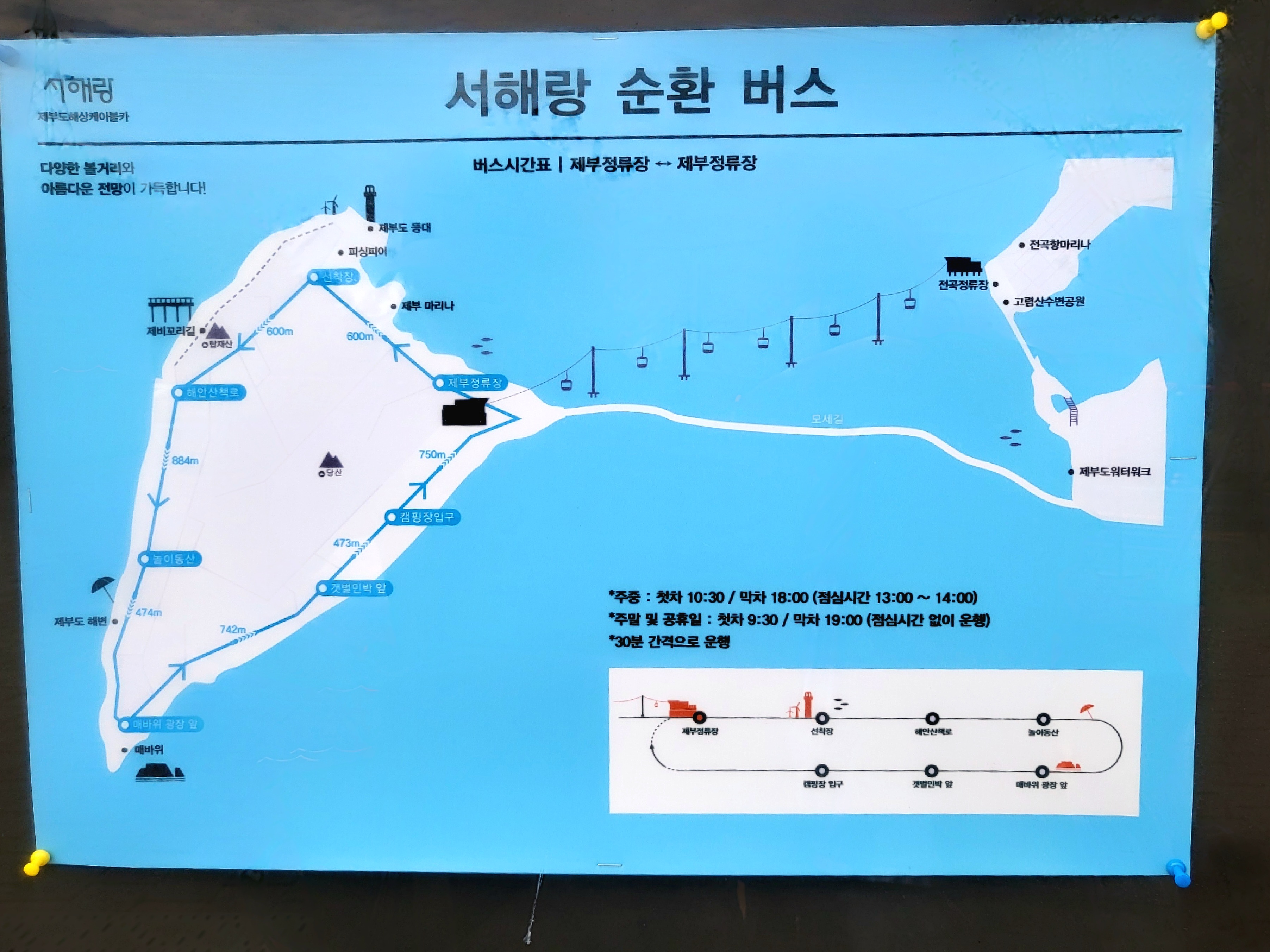 제부도 정거장에 도착해서 나와보니 무료 순환버스가 운행 중이었습니다. 30분 간격으로 운행되는데 유명한 포인트마다 버스가 멈춰서 내려서 구경할 수 있도록 운행하고 있더라고요. 케이블카 타고 제부도 넘어오면 교통은 어째야 하나 싶었는데 서해랑은 다 계획이 있었어요ㅋㅋㅋ