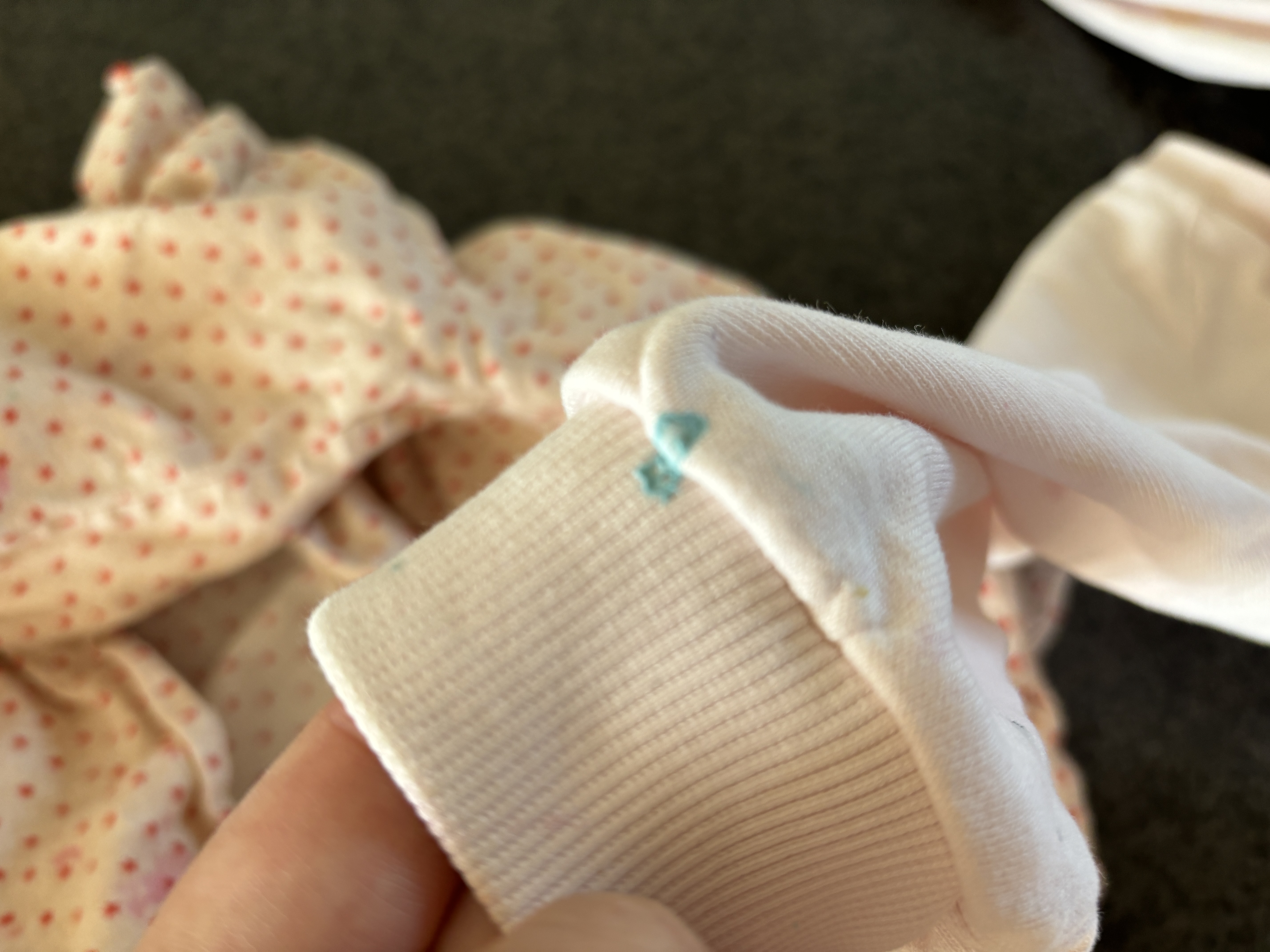 짜잔! 저희집 똥강아지들이 신나게 논 흔적이예요. 그냥 세탁기에 돌려버리면 지워지지 않고 딱딱한 상태로 옷에 남아있더라고요. 왼쪽은 클리어 슬라임, 오른쪽은 버터 슬라임이 묻었어요.