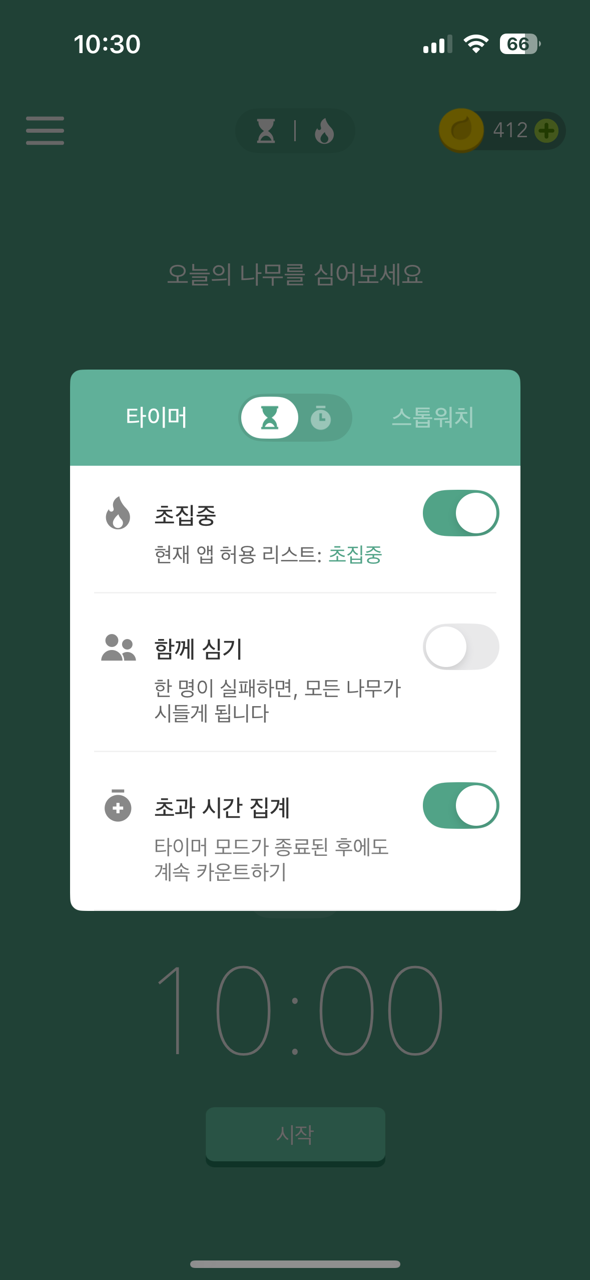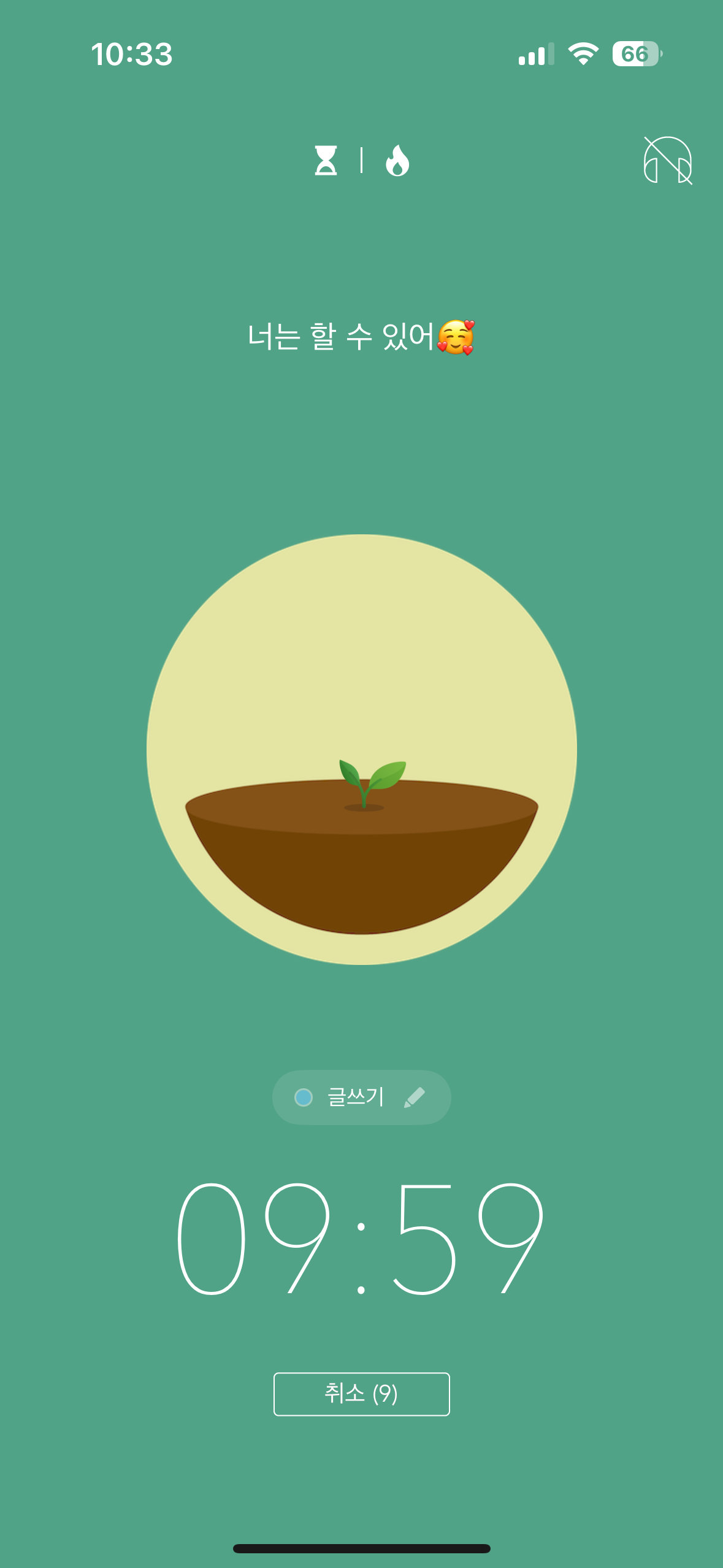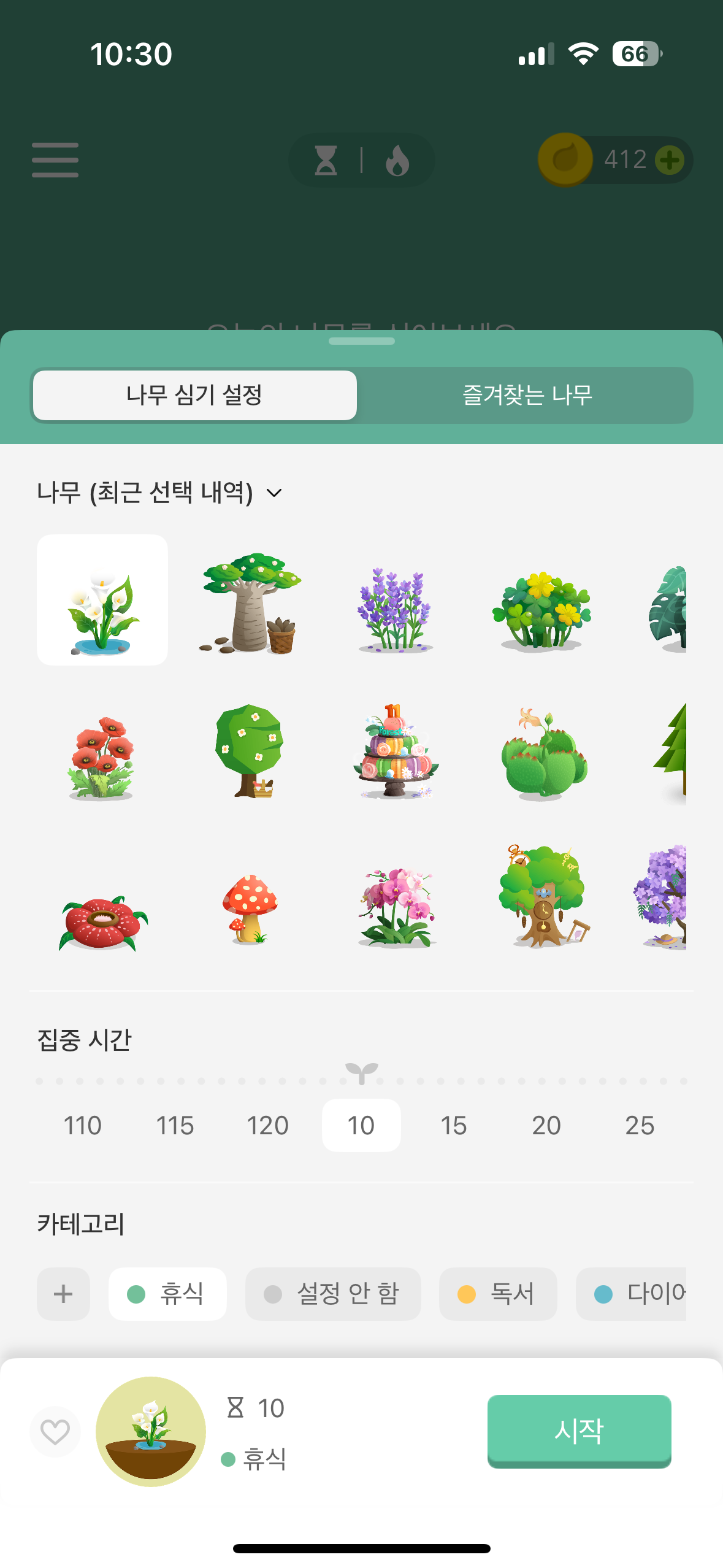 오늘 심을 나무를 선택하고 집중할 카테고리를 선택한 후 시작을 누르면 실행이 됩니다. 초집중 모드로 해놓으면 허용된 리스트의 앱만 켤 수 있어요. 위에 헤드폰 모양을 누르면 배경음악을 선택할 수 있습니다. 배경음악은 상점에서 코인이나 크리스탈로 살 수 있는데 평소에 나무를 자주 심다보면 은근히 쉽게 모을 수 있습니다. 배경음악도 좋은게 많아서 기분에 따라 골라 켜놓는데 자꾸 듣다보니 이 음악이 들리면 '아, 지금 집중할 시간이지.'라는 생각을 무의식적으로 하게 되는 것 같아요.