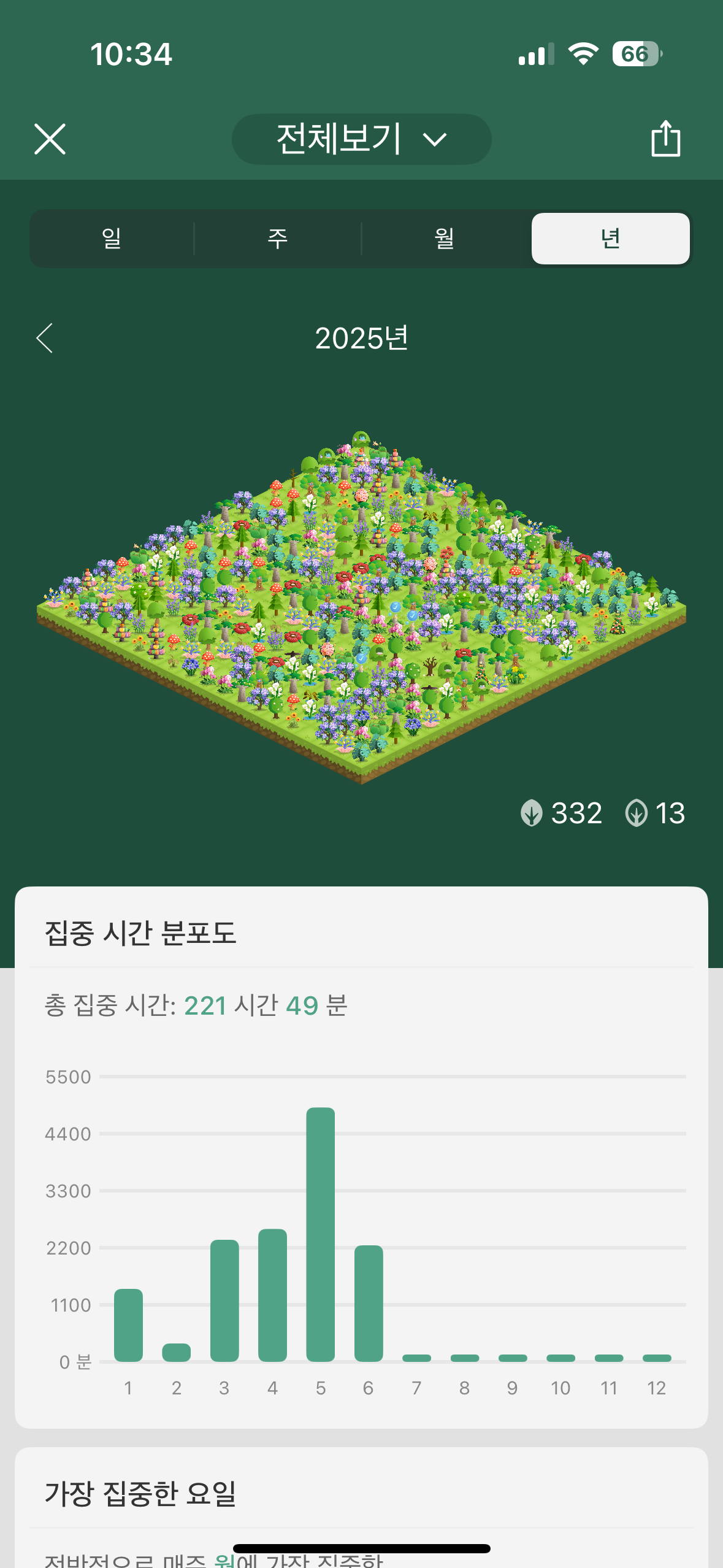 집중시간 분포도를 확인하면 일, 주, 월, 년 단위로 얼마나 스마트폰을 멀리하고 집중하고 싶은 일에 집중했는지 직관적으로 확인할 수 있어서 좋은 것 같아요.