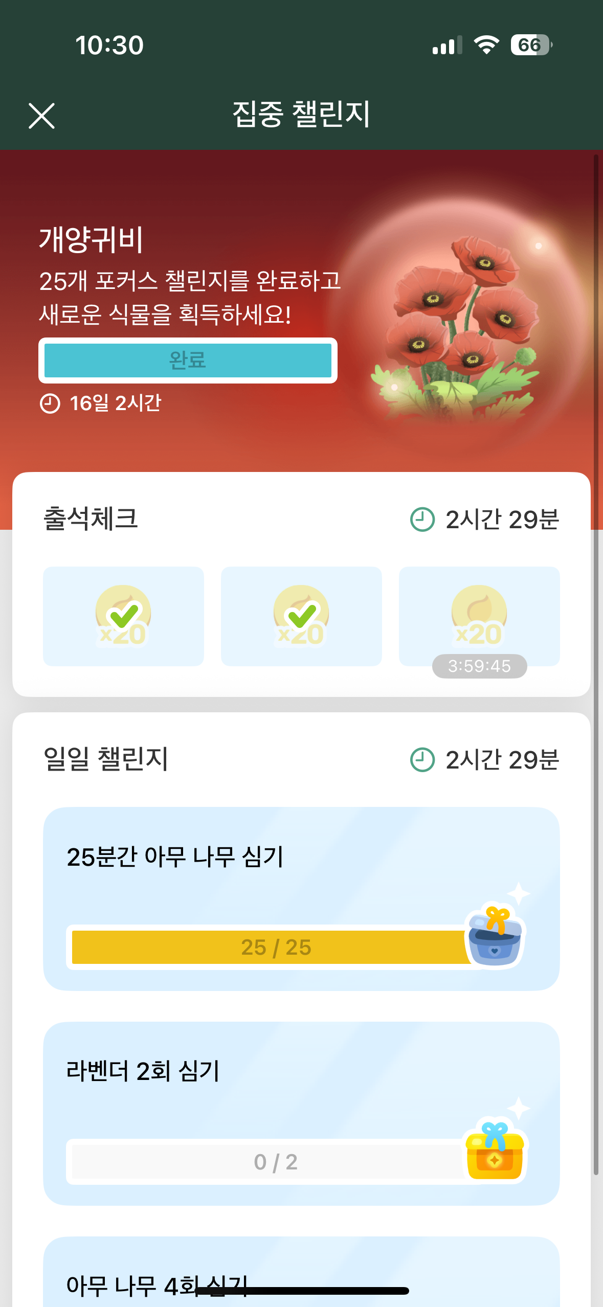 집중 챌린지는 한달에 한 번씩 하는 이벤튼데 매달 획득할 수 있는 나무가 달라요. 일일 챌린지를 완수하면 되요.