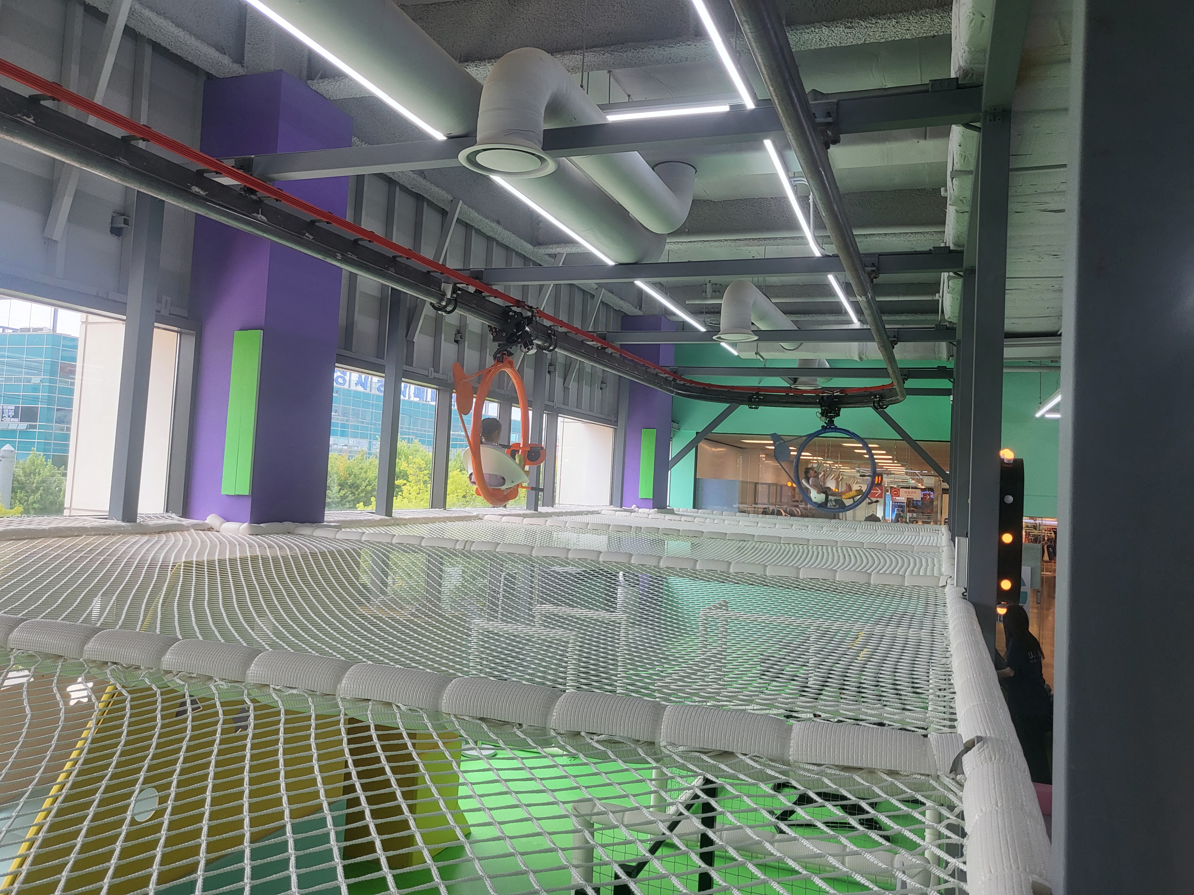 옆에 대형 트램폴린도 있고 불풀장 위쪽으로는 아이들이 로스트벨리의 다람쥐처럼 지나다닐 수 있는 그물길도 있어요. 그 그물길이 슬라이드 쪽으로 연결되어있어요. 저희는 여기 7월 초에 방문했는데 일부로 에어컨을 틀지 않는지 너무너무 더웠어요. 직원분들도 다들 개인 선풍기 켜놓고 일하시더라고요~ 아니면 저희가 방문한 날만 에어컨이 고장났던걸까요...? 조만간 또 가는데 확인해보겠습니다.