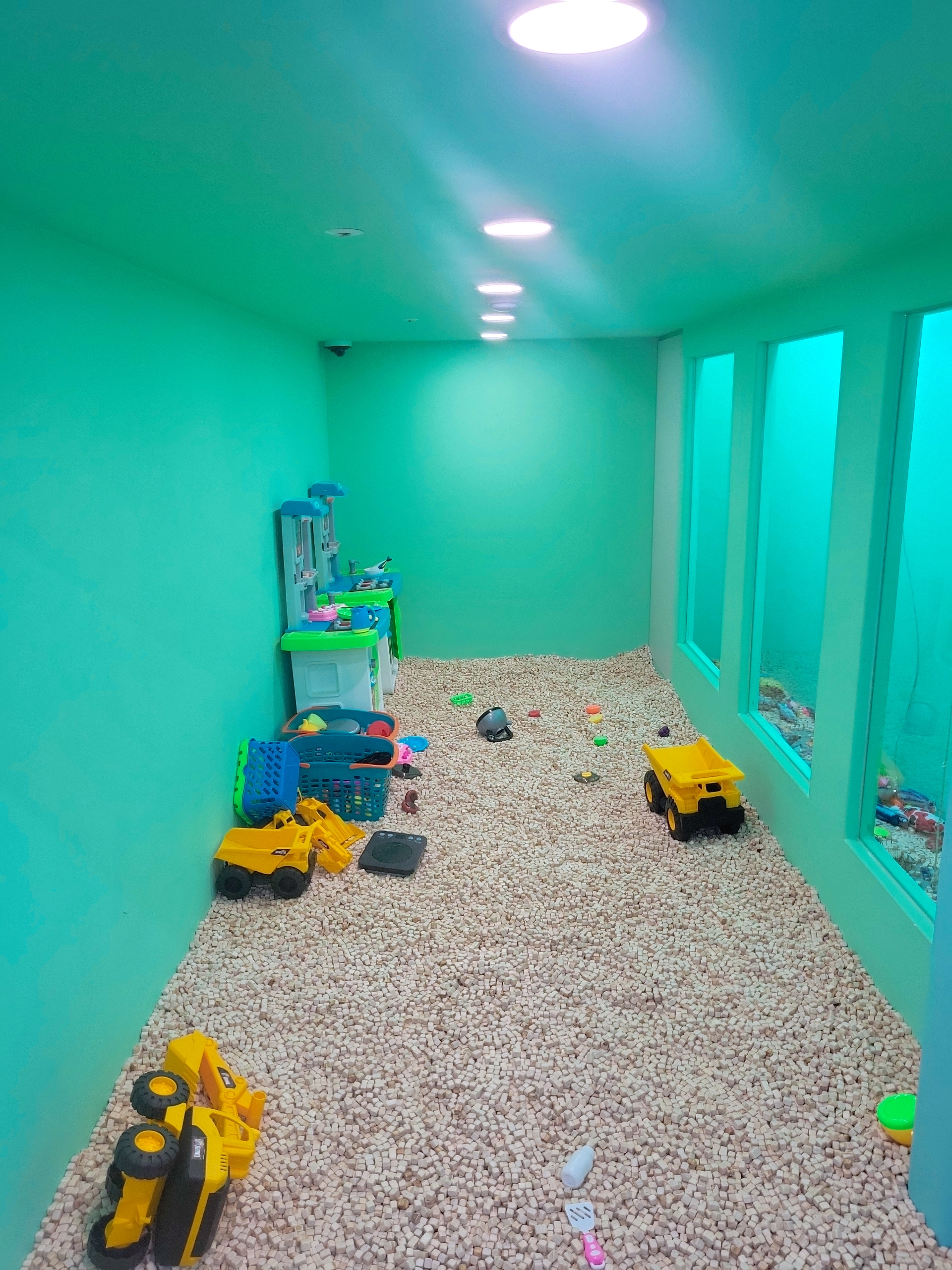 어린친구들이 좋아하는 편백나무칩이 있는 공간도 있어요. 옆에 낚시용 물고기 인형도 보이네요~ 이 공간 2층이 낚시터인데 너무 더움.....