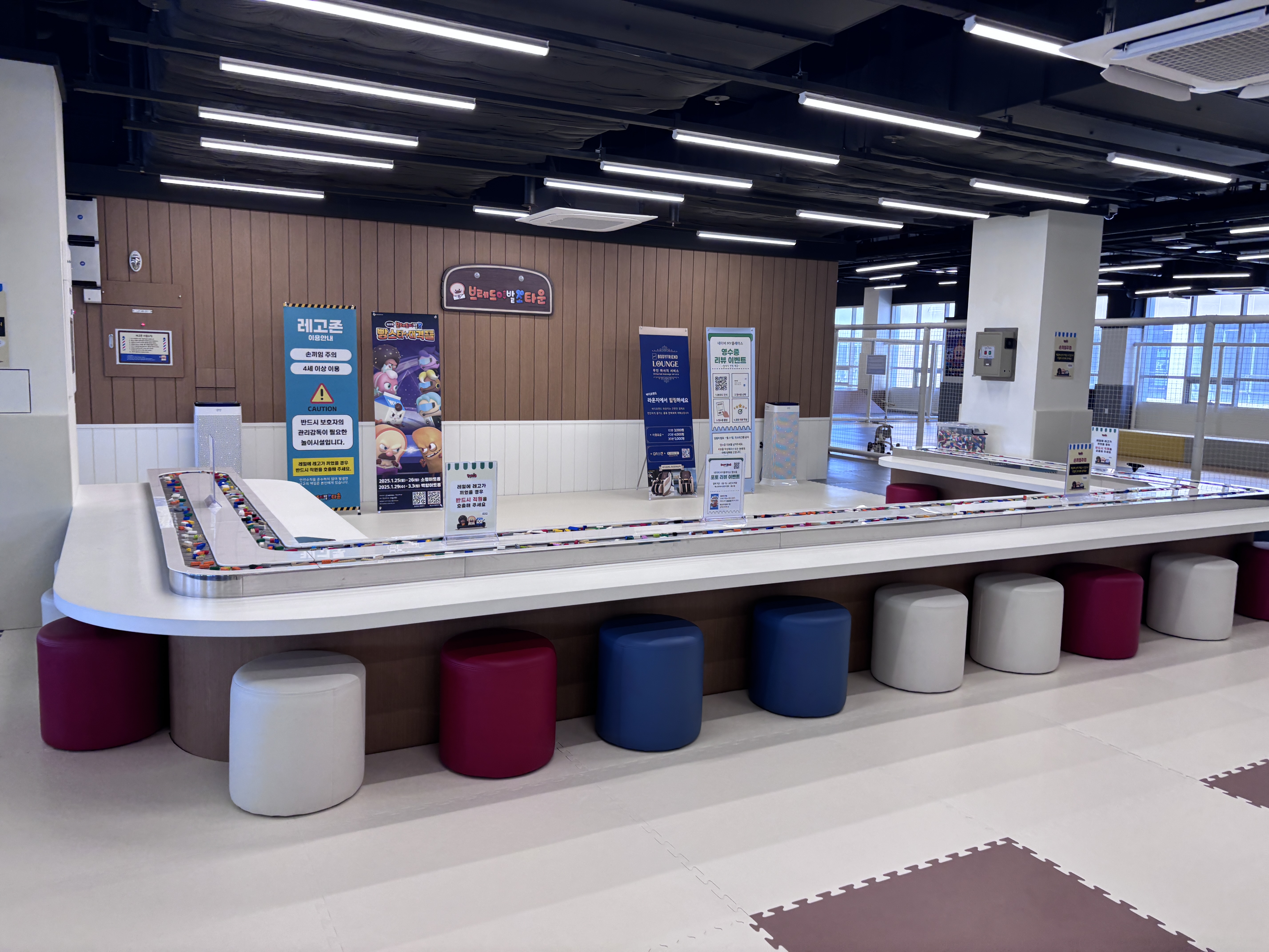 볼풀장 뒷쪽으론 낚시하는 공간이 있어요. 오른쪽은 레고존인데 레고존엔 회전초밥처럼 레고 피스들이 돌아가요. 앉아서 블럭놀이를 하기도 좋습니다. 레고존 뒷편엔 편백큐브가 있는 공간도 있어요.