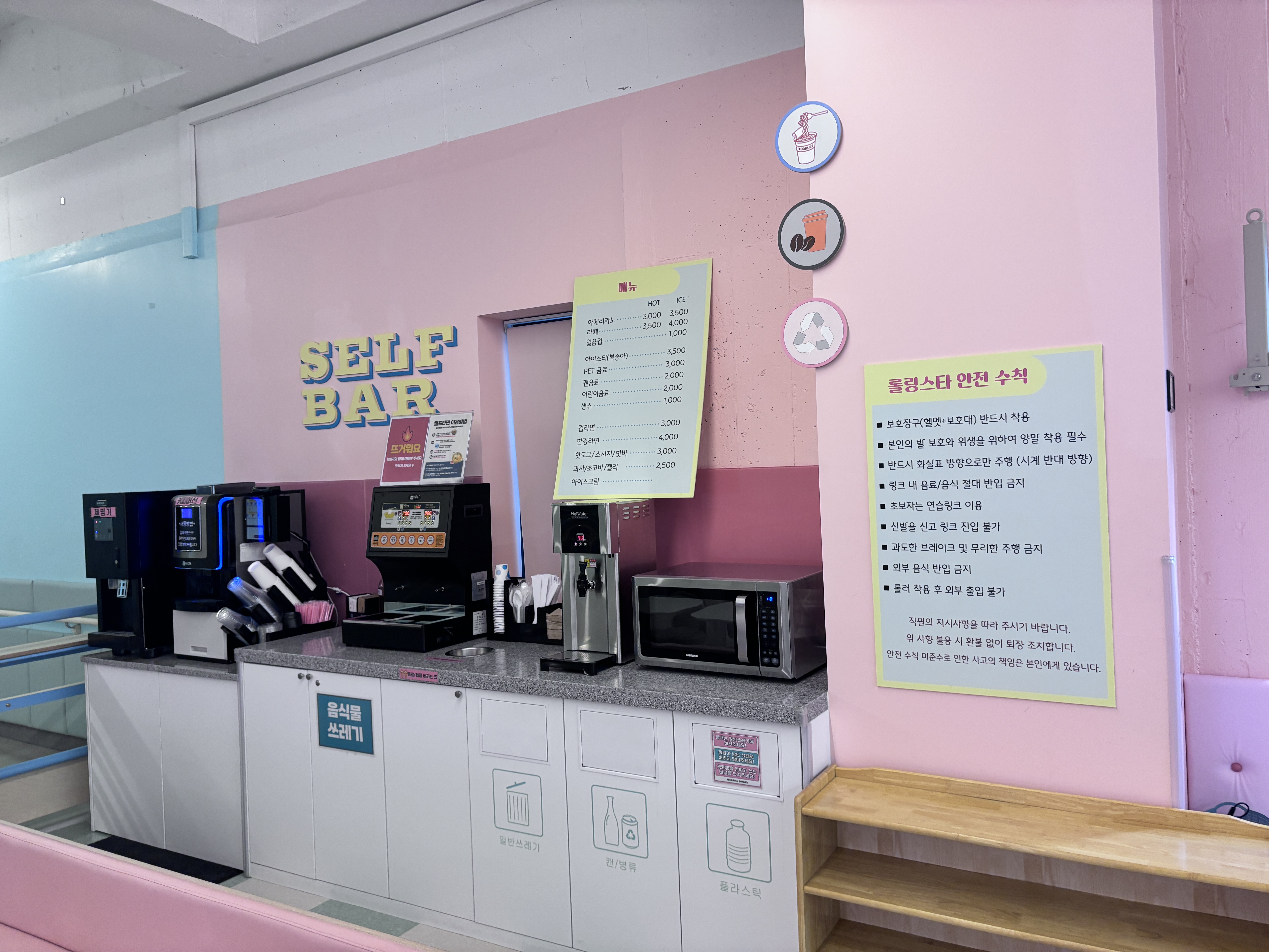롤링스타는 롤러를 타지 않고 입장만 한 사람들에겐 음료권을 줘요. 셀프바에 있는 머신에 핸드폰 번호를 입력하면 음료쿠폰 사용을 사용할 수 있도록 되어 있습니다. 아이스아메리카노를 선택했더니 컵을 얼음기계에 갖다 대라, 커피 머신에 갖다 대라 뭐 이런 안내가 나오더라고요. 커피에 반하다 같은 시스템인가봐요. 아쉬웠던 것은 텀블러에 담고 싶었는데 텀블러가 커서 커피 담기가 아슬아슬 해서 결국 일회용 컵을 썼다는 것이었어요ㅜㅜ