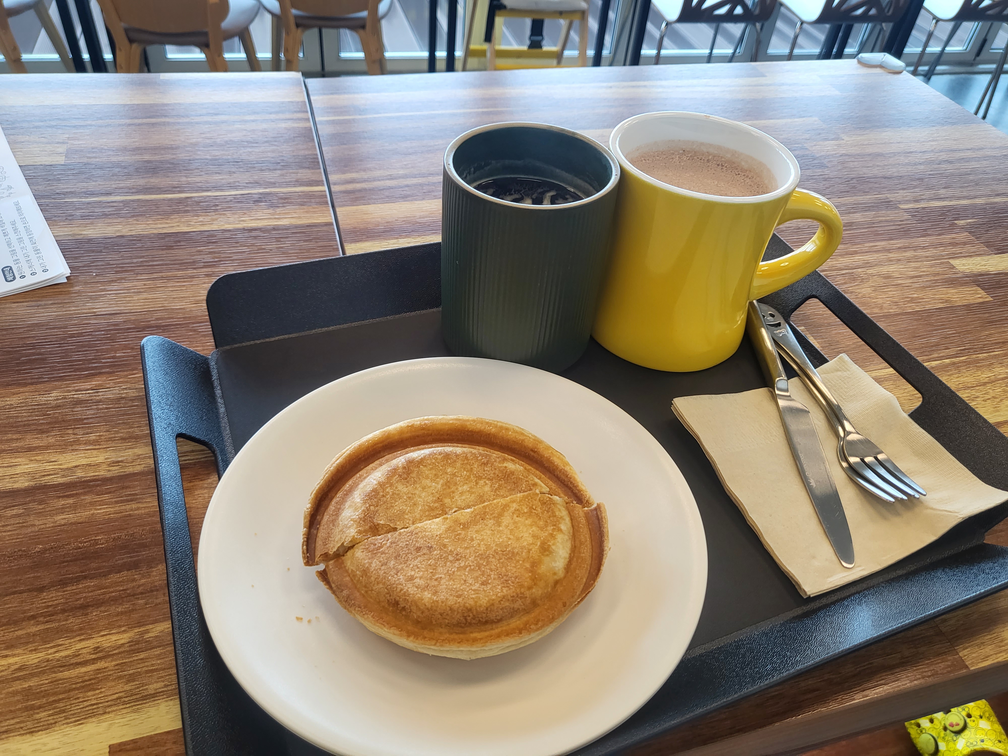 저희는 애플파이와 따뜻한 아메리카노, 핫초코를 주문했어요. 저는 원래 애플파이를 좋아하기때문에 사과를 좋아하는 딸을 꼬셔서 애플파이를 먹어보았어요. 저희 딸은 목소리는 엄청 맛있는 목소이린데 행동은 사과 부분은 엄마가 먹고 겉에 바삭한 빵만 자길 달라고 하더라고요. 파이에 딸이 좋아하는 모짜렐라 치즈도 들어있었는데도 저러는거 보면 따뜻한 사과가 낯설었나봅니다. 저는 물론 그냥 다 맛있었어요. 초코라떼도 많이 달지 않아 아이 먹이기에 좋았어요.