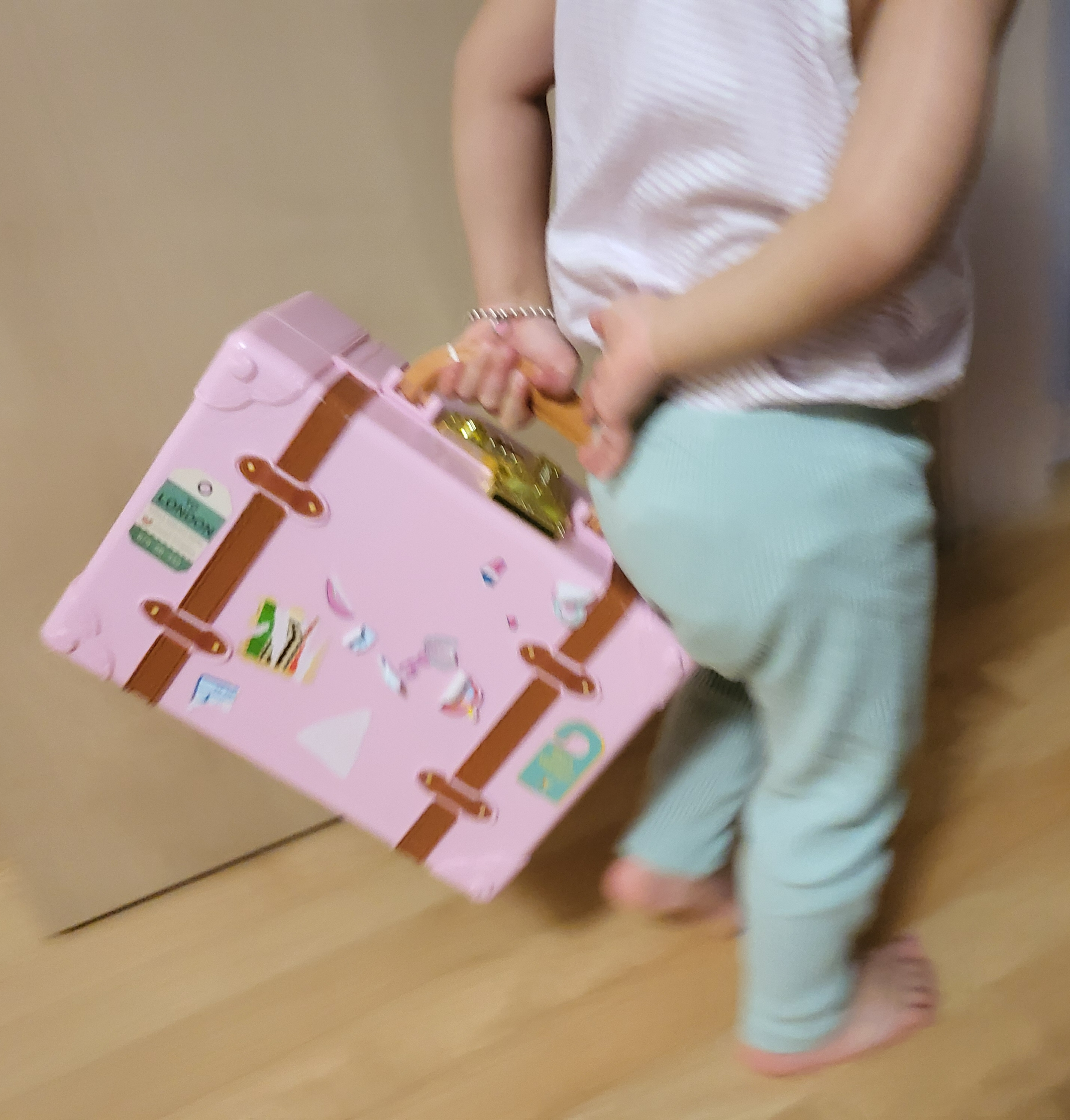 가끔 할머니댁에 놀러갈 때 이 장난감을 챙겨가기도 합니다. 크기가 작기 때문에 간편히 챙길 수 있기 때문이에요. 인형과 소품을 가방에 쏙 넣어 아이 스스로가 들고 갈 수 있기 때문에예요. 할머니네 가면 장난감이 없어 심심하다고 하는데 가방을 가지고 간 날에는 심심하다는 말이 덜 나옵니다. 할머니 하고 인형놀이를 하고 놀 수 있으니까요.