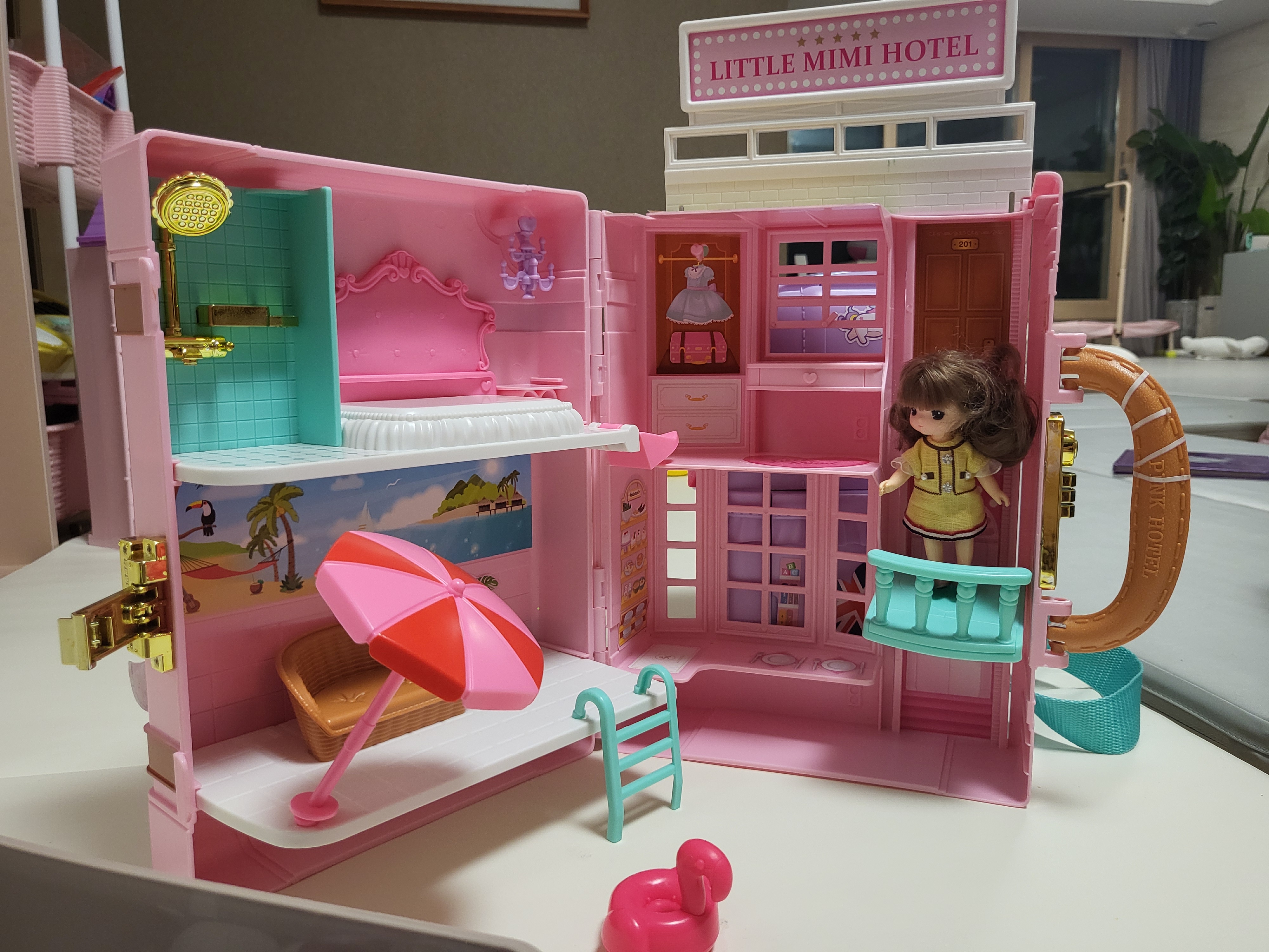 리틀미미 가방호텔을 펼쳤을 때 모습이에요. 밑에 수영장도 있고 브런치 메뉴, 전화기, 샤워용품 등 소품이 많은데 보이는 것만 골라서 포스팅해봅니다. 침실, 거실, 수영장, 욕실, 드레스룸, 키친으로 구성되어 있어요.