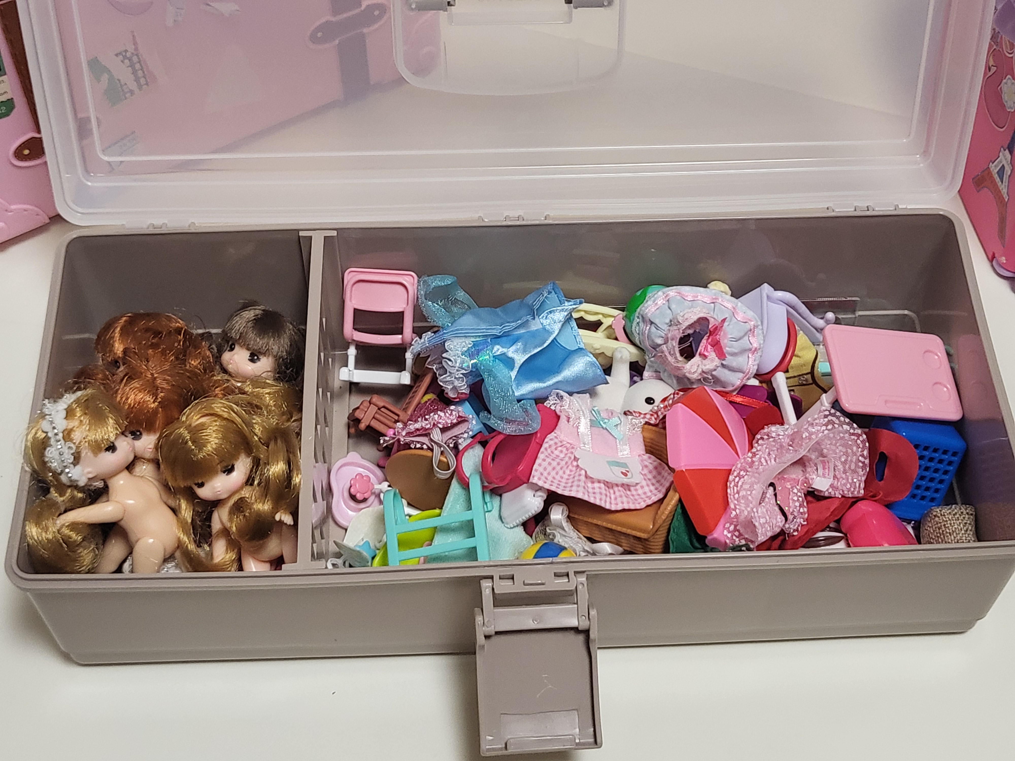 그래서 이렇게 칸칸 나뉘어져 있는 수납함에 한 번에 수납하고 있습니다. 인형이 작아서 그런지 크지 않은 수납함에 제법 많이 들어가서 정리하기도 좋은 것 같아요. 이 수납함은 스너지 칸칸칸 인데 예전에 맘카페에서 플레이도우 크리에이티브 책상 구성품을 넣어두기 좋은 상자로 유행하기도 했어요. 나중에 플레이도 도구 넣어 보관한 모습도 포스팅해볼게요.