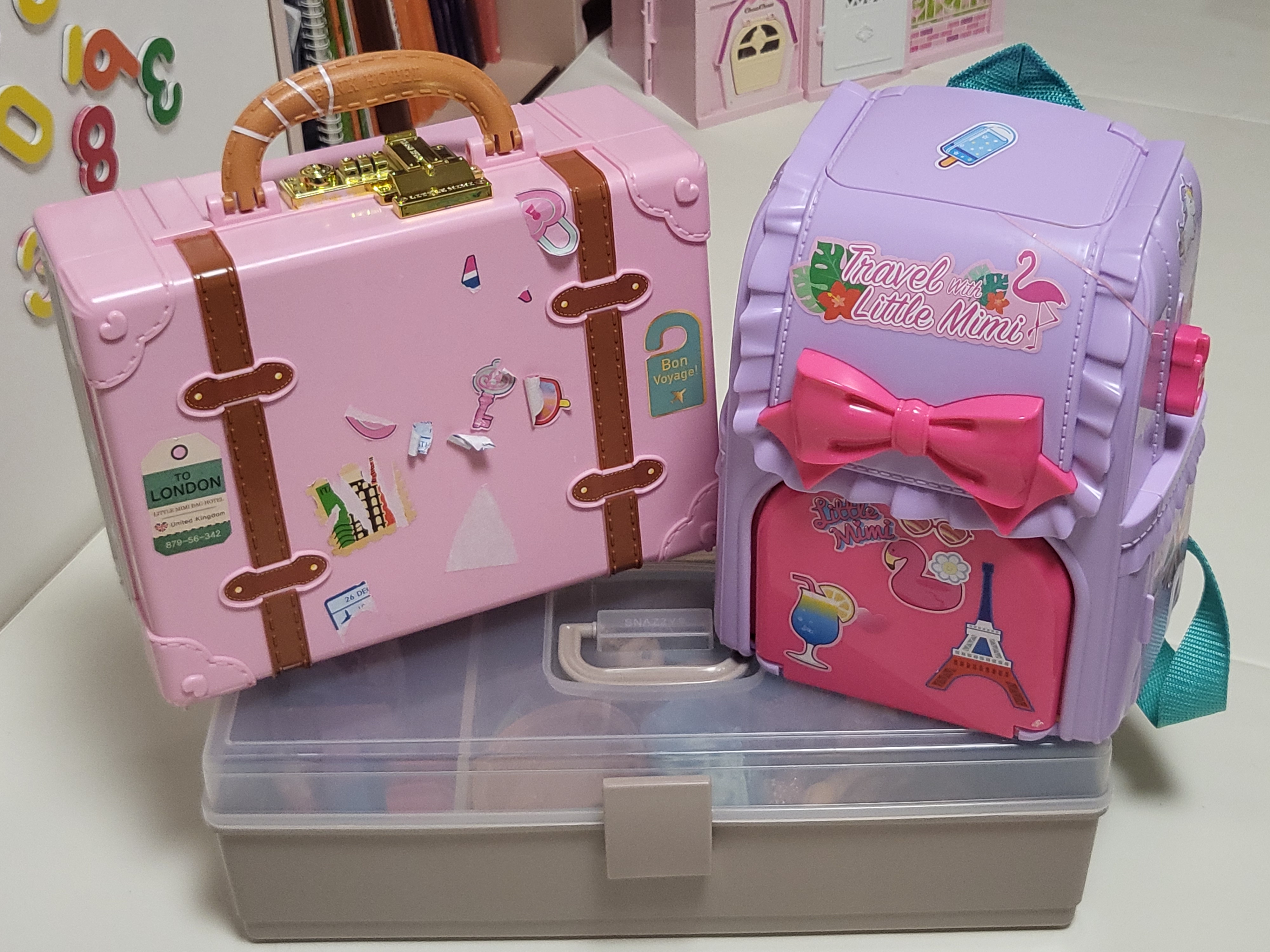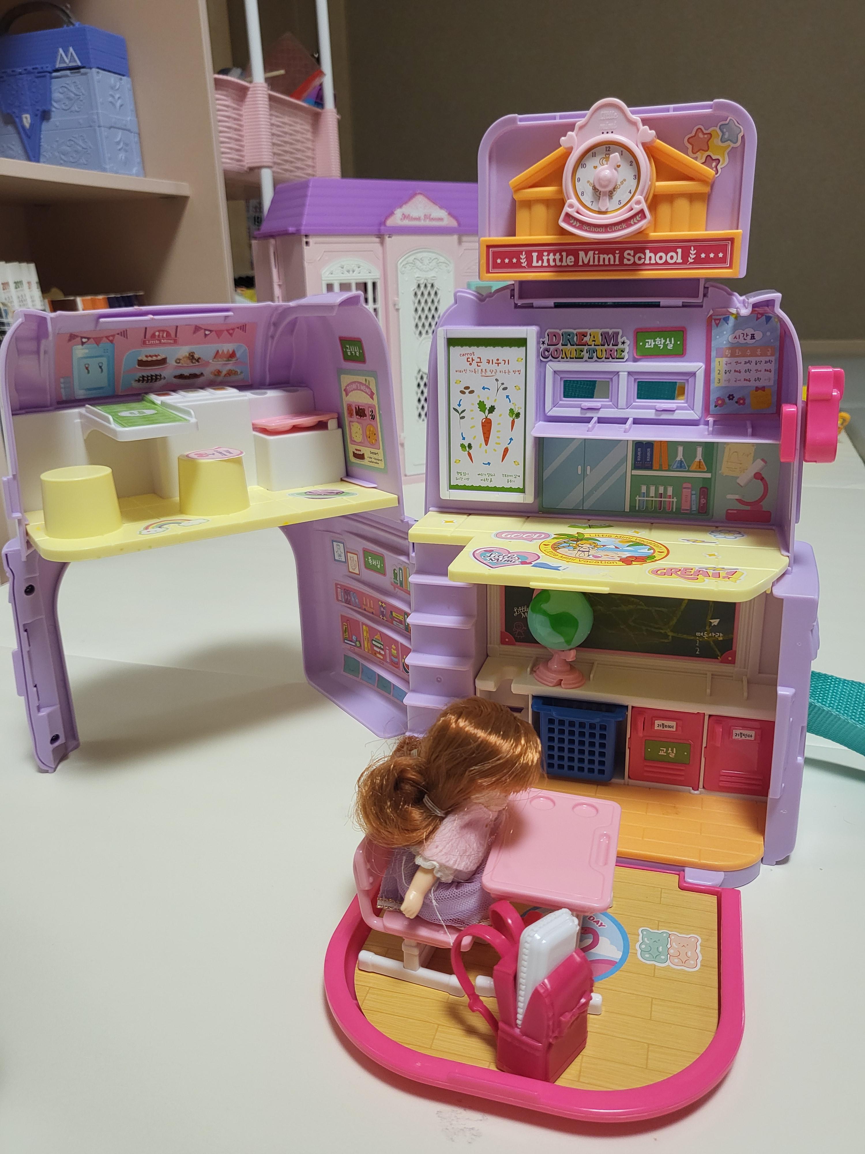 리틀미미 가방스쿨 펼친 모습입니다. 가방스쿨도 구성품을 다 꺼내지 않고 보이는 대로만 꺼내봤어요ㅎㅎㅎ 저희 아이들인 신레렐라, 발레리나, 빨간 망토 등 추가적으로 선물 받은 리틀미미 팩들이 많이 있어서 소품이 너무 많아요 ㅠㅠ 골라내기 힘들어서 기억나는 몇 개만 올려놔 보았습니다.
