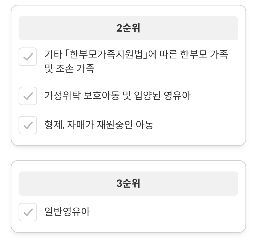 이렇게 순위를 선택하는데 1순위 중에서도 맞벌이+다자녀면 300점, 다자녀 또는 맞벌이면 200점입니다. 3순위인 일반영유아만 선택하면 3순위 0점이 나오더라고요. 순위정보 변경 후 입소대기를 신청하시면 모든게 끝납니다.