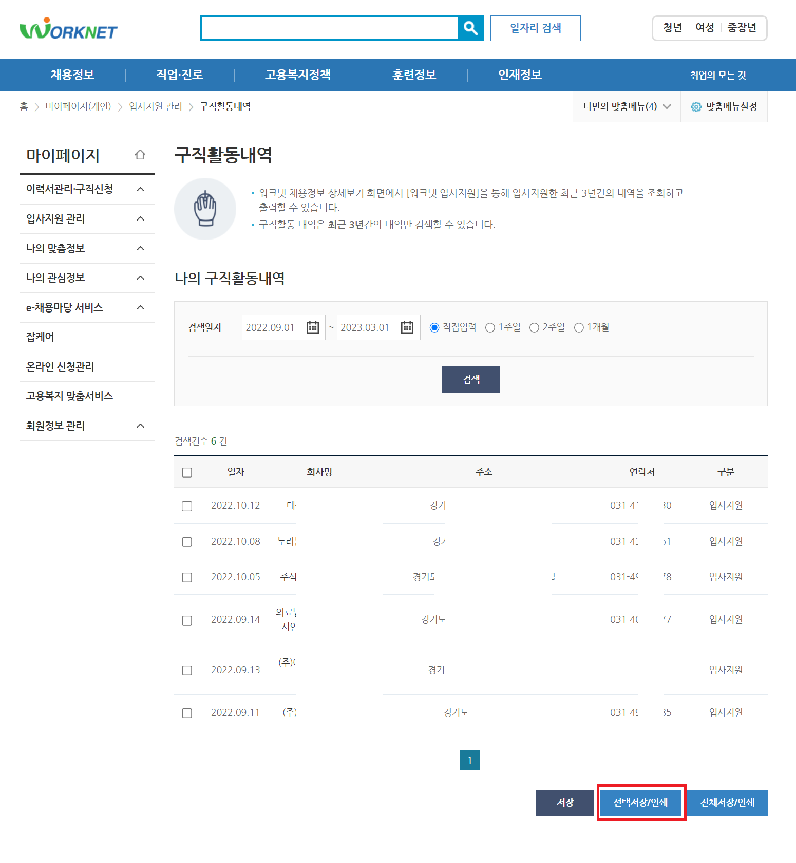 워크넷에서 구직활동내역을 클릭하셔서 조회 기간 설정을 하세요. 그럼 그 기간에 워크넷에서 입사지원했던 내역이 쭉 나옵니다. 요걸 전체선택 한 후 선택저장/인쇄 버튼을 클릭하세요.
