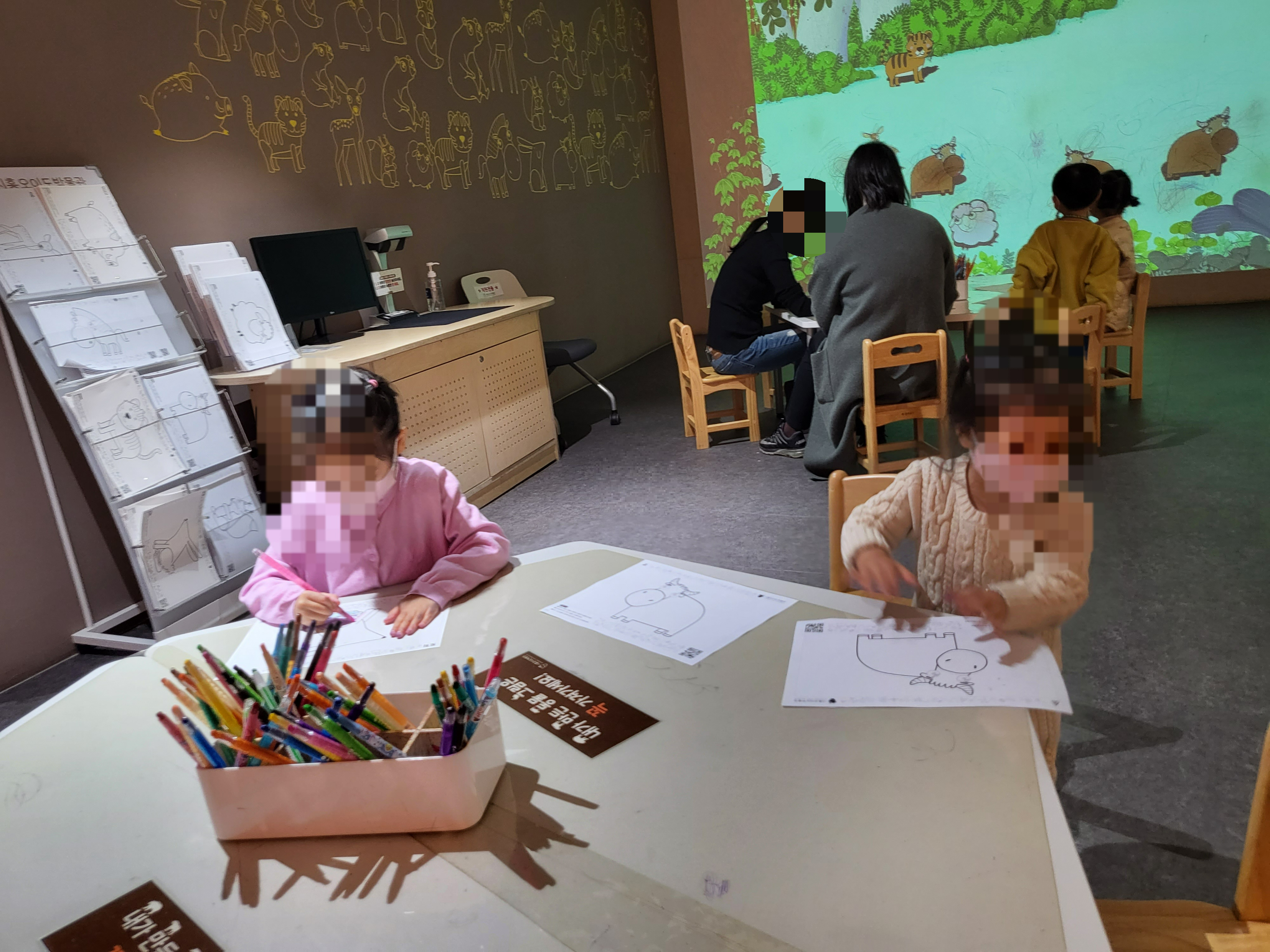 자리를 옮겨 인터렉티브 미디어 섹션으로 넘어왔어요. 선사시대에 살았던 동물 중 각자 마음에 드는 동물을 가지고 자리에 앉아 또 열심히 색칠합니다. 자기가 색칠한 동물을 스캔하면 대형 화면에 뿅 하고 나와서 움직여요. 우리 둘째는 처음 해보는 놀이라 신기해했습니다.