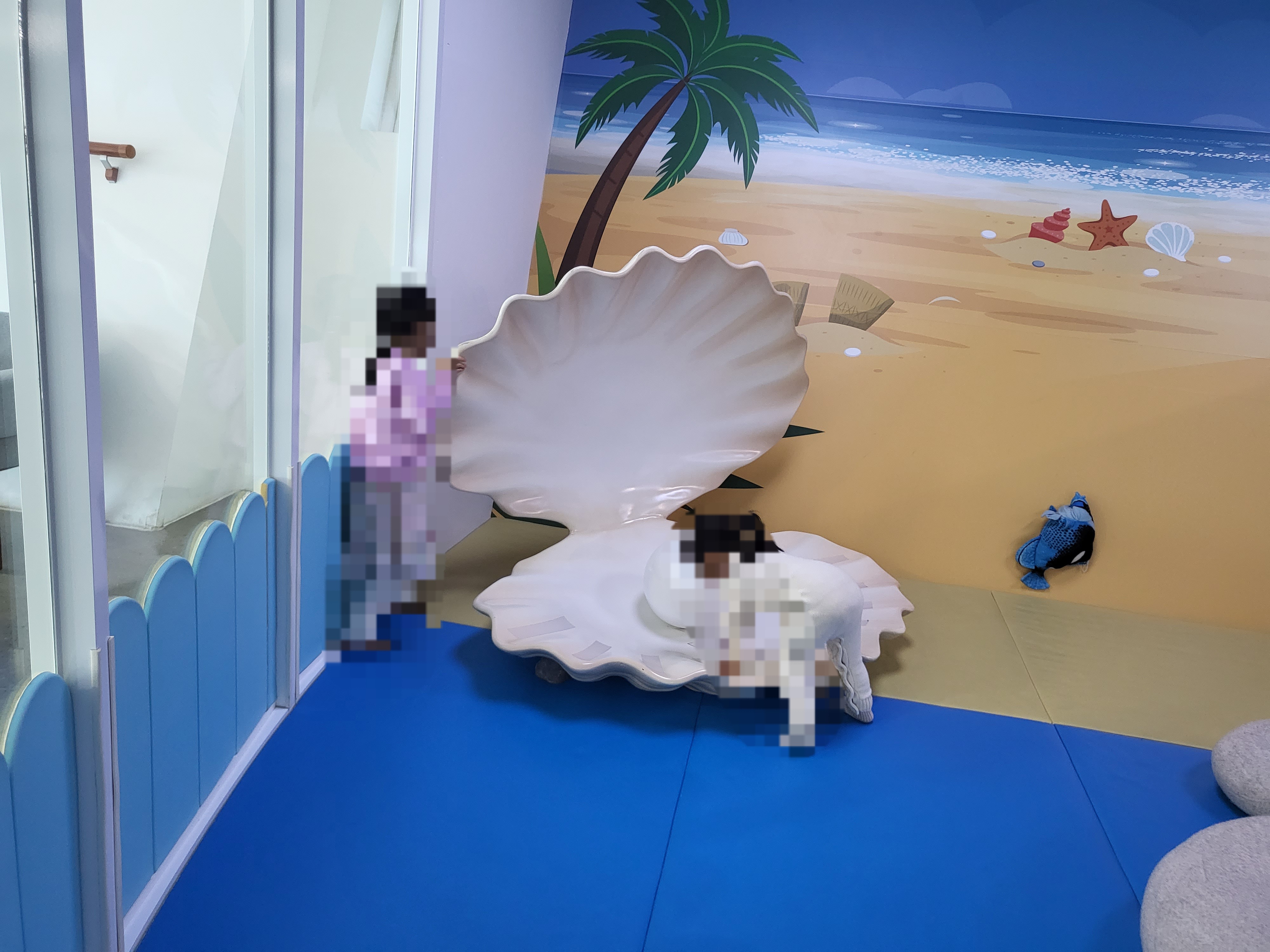 해안가놀이터는 신발을 벗고 들어가는 곳입니다. 자유롭게 놀이할 수 있도록 넓은 공간을 바닷가로 꾸며놓았어요. 물고기 인형들도 많이 있어요. 저희아이들은 인어공주 진주조개 너무 좋아해요... 바바파파책에서 벨이 진주를 구하러 바닷속으로 들어가는 내용이 있는데 그 책을 진짜 좋아했거든요....