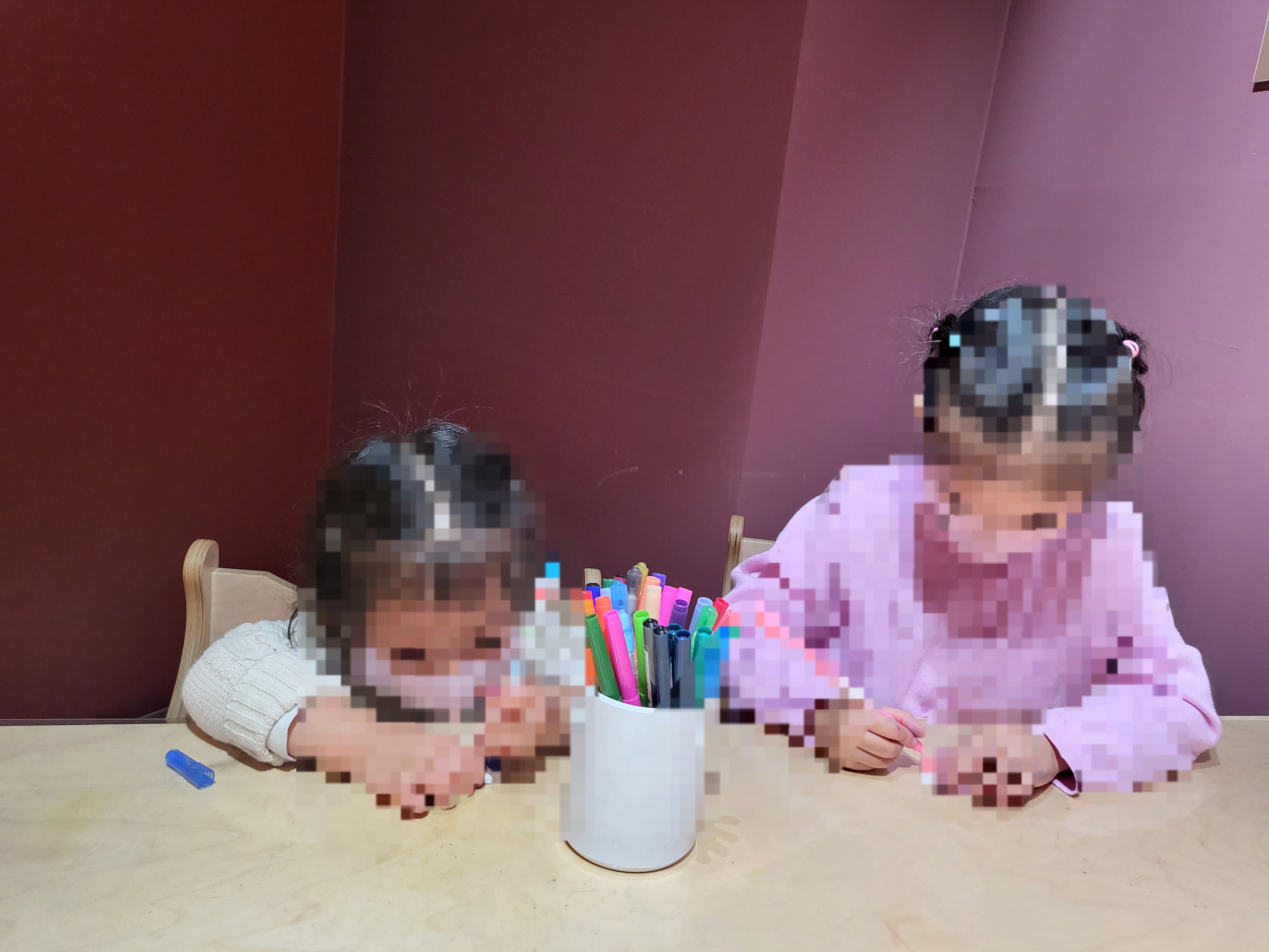 도토리 꾸미기가 끝난 후 스텐실 작업을 열심히 해봅니다. 동생은 눈치껏 언니가 하는걸 보고 흉내를 내는데 제법 야무지게 따라하더라고요? 이래서 둘째가 빠르다고 하나보다 싶었어요. 열심히 롤러를 굴리며 이게 뭐냐, 뭐하는 물건이냐 물어봐서 대답해주니 신기해하더라고요! 한참을 스템프에 롤러를 굴려가며 스텐실을 하고 놀다가 이제 시간이 얼마 남지 않았다고 얘기해주니 그제서야 엉덩이를 떼고 다른곳으로 향합니다.