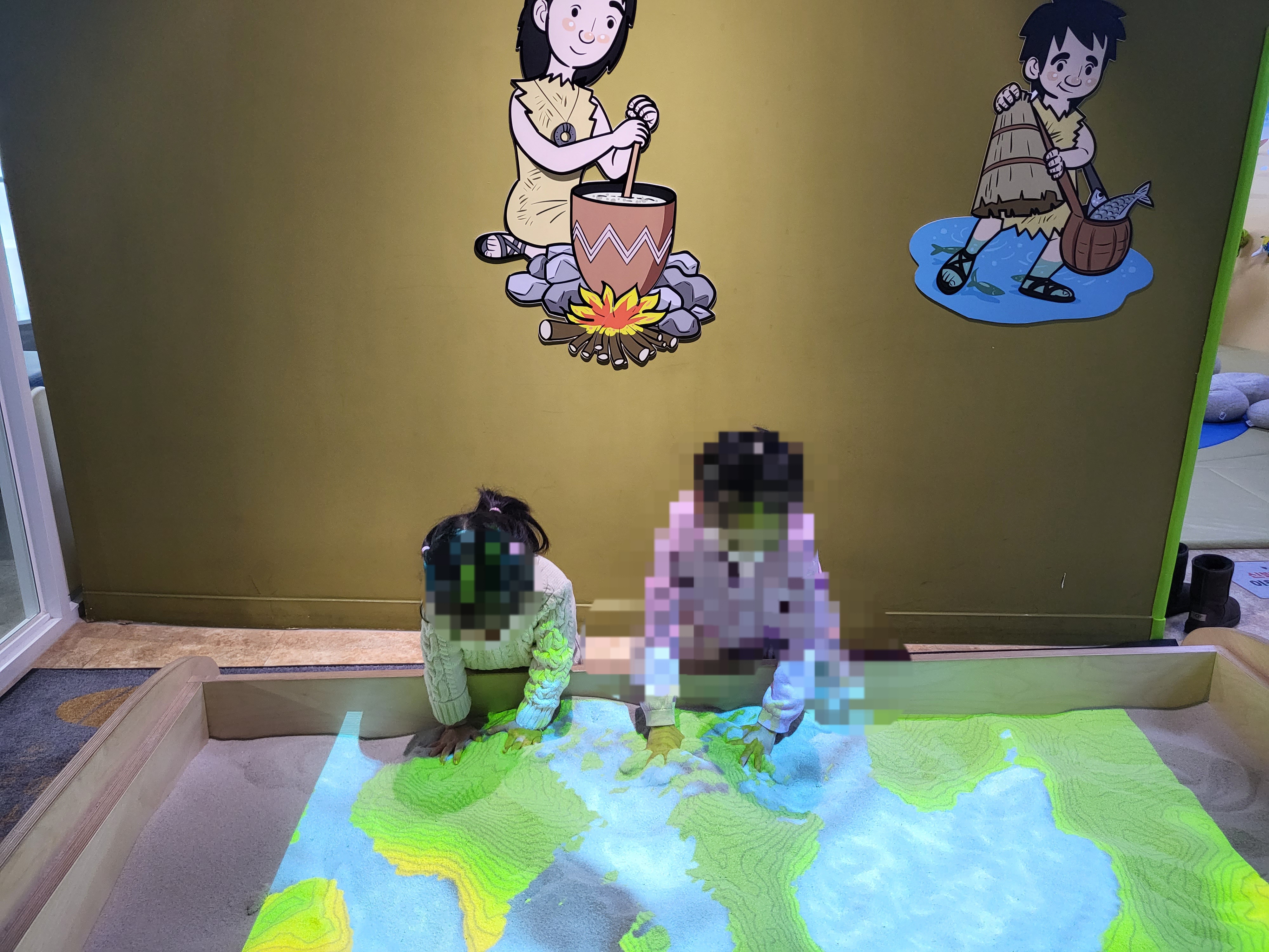 모래놀이는 위에서 빔이 나와 게임을 할 수 있어요. 예전엔 모래 속에 조개나 소라껍데기를 숨겨두고 발견하는 놀이를 할 수 있게 해놨었는데 어느 순간 인터렉티브 미디어를 활용하더라고요. 개인적으론 미디어보단 조개나 소라껍질을 찾으며 놀이할 수 있도록 했던게 더 좋았어요. 아이들이 조개 찾고 땡! 하는게 아니라 다양한 상상놀이와 역할놀이를 하며 편하게 놀이할 수 있기 때문이에요. 게임으로 바뀌니 그럴 수 없어 아쉬웠습니다.