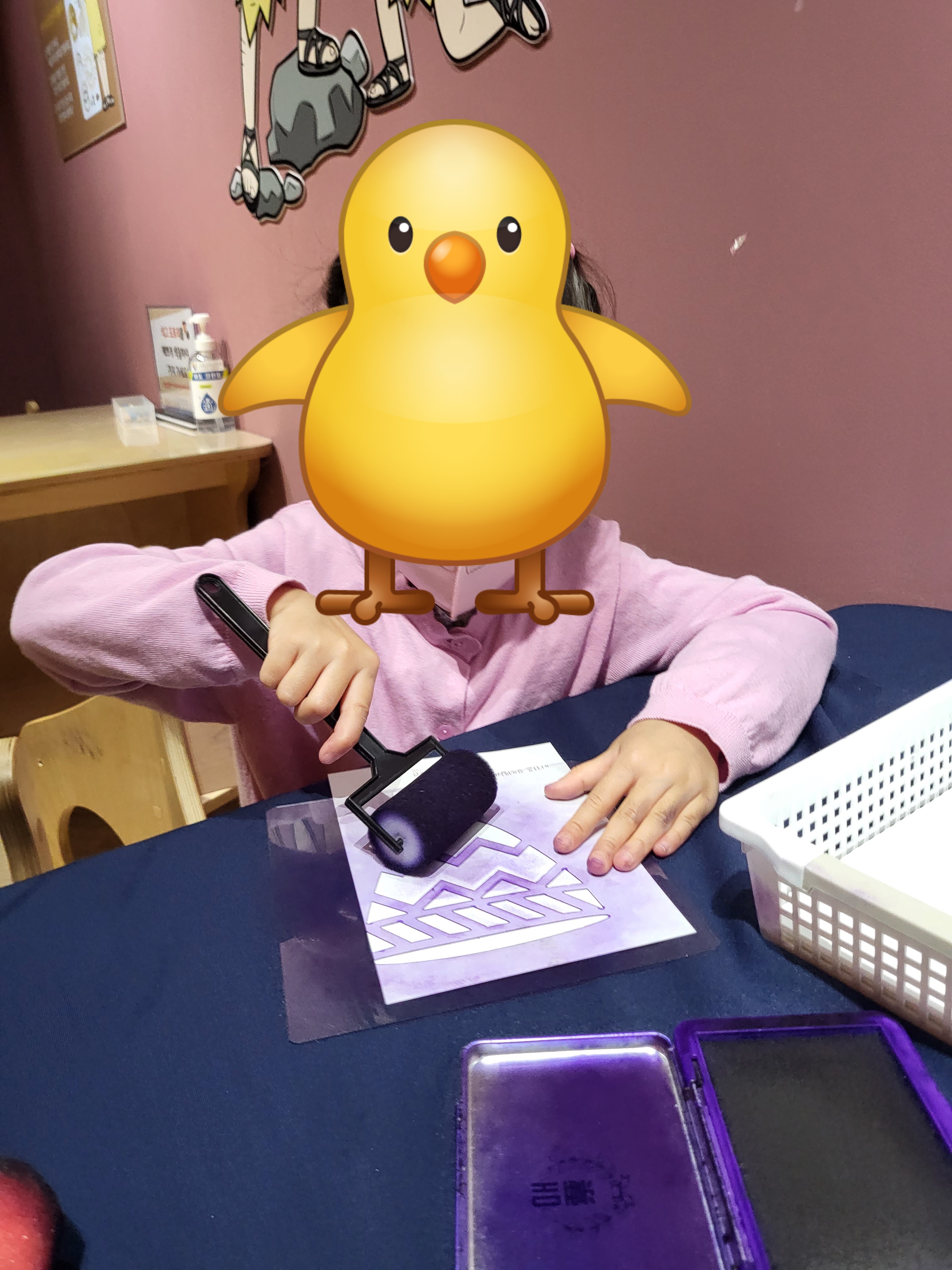 도토리 꾸미기가 끝난 후 스텐실 작업을 열심히 해봅니다. 동생은 눈치껏 언니가 하는걸 보고 흉내를 내는데 제법 야무지게 따라하더라고요? 이래서 둘째가 빠르다고 하나보다 싶었어요. 열심히 롤러를 굴리며 이게 뭐냐, 뭐하는 물건이냐 물어봐서 대답해주니 신기해하더라고요! 한참을 스템프에 롤러를 굴려가며 스텐실을 하고 놀다가 이제 시간이 얼마 남지 않았다고 얘기해주니 그제서야 엉덩이를 떼고 다른곳으로 향합니다.