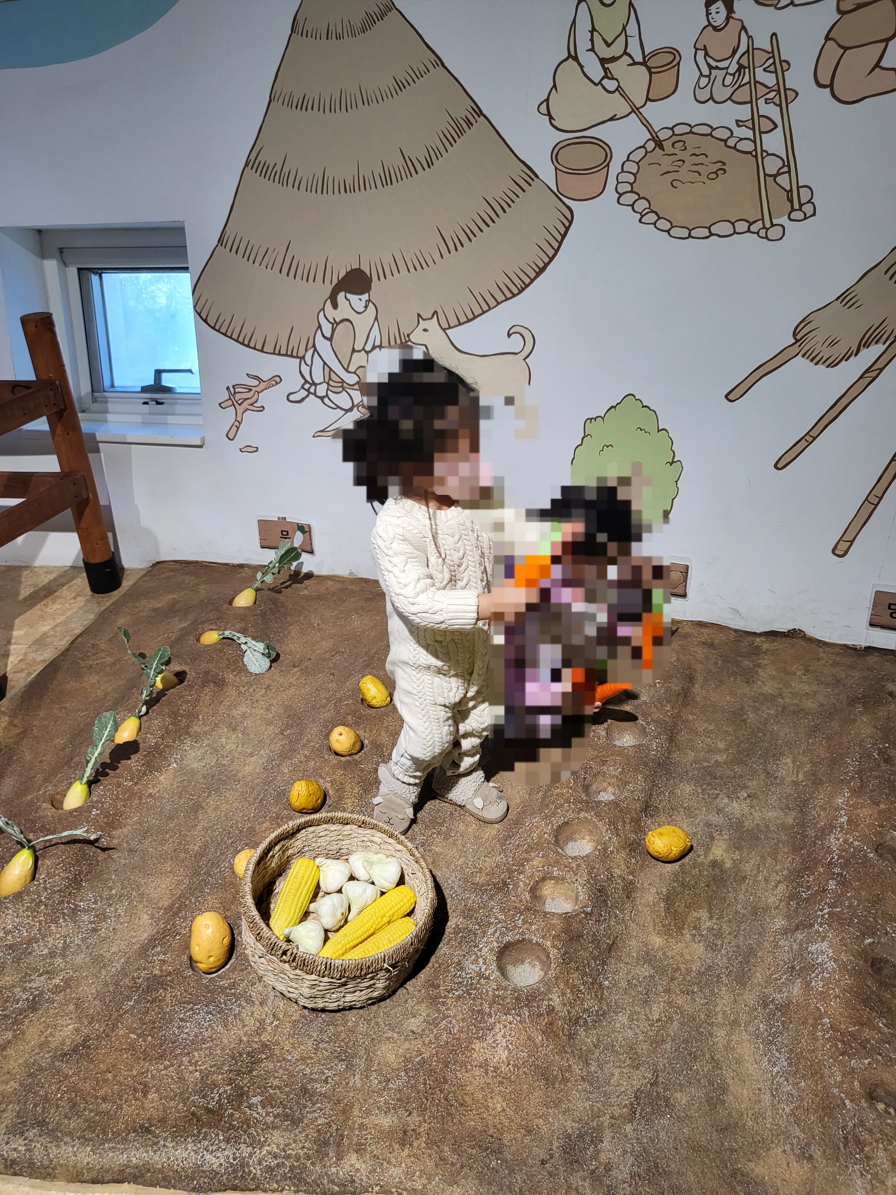 신석기 시대에 이루어졌던 농업을 체험해 볼 수있어요. 옛날 사람들은 당근, 감자, 옥수수 이런걸 키워서 먹었다며 열심히 모형 채소를 넣었다 뺐다 합니다. 확실히 둘이 같이 가니 역할놀이를 하며 재밌게 놀더라고요~
