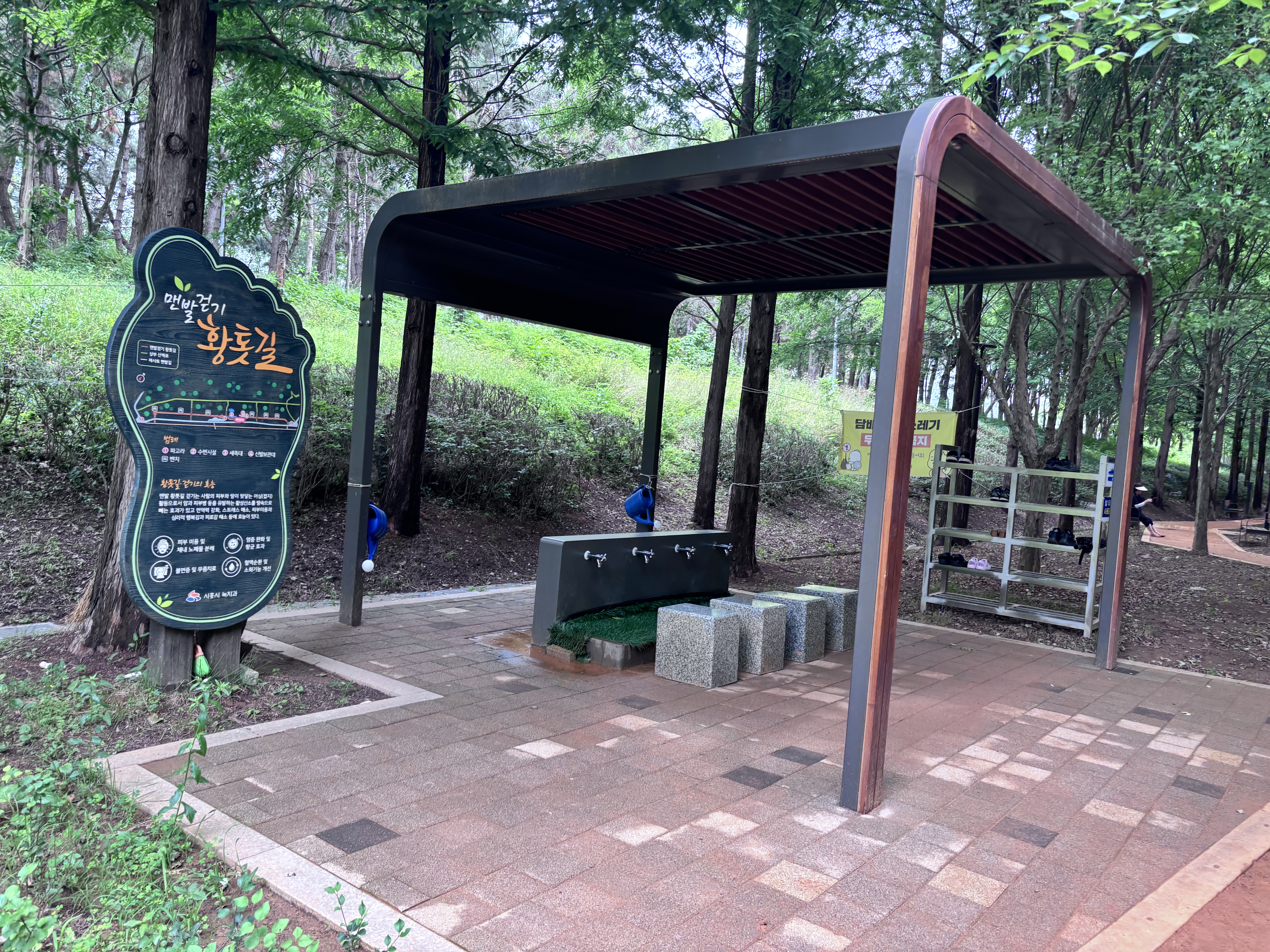 요 몇 년 사이에 맨발걷기가 유행처럼 번지면서 황톳길을 조성한 곳이 많아진 것 같아요. 편하게 앉아 발을 닦을 수 있는 세족대와 신발을 올려놓을 수 있는 신발보관대가 함께 있어서 너무 좋아요. 준비해야 할 것은 수건 정도면 됩니다.
