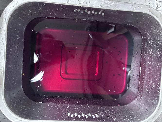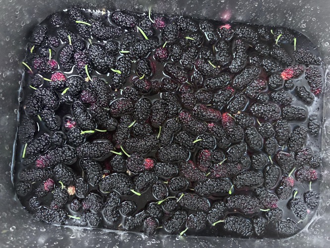 조언대로 일단 얼리려면 씻어야 하기 때문에 일단 물을 받은 후 오디를 씻기 위해 넣었습니다. 오디를 담그기만 했는데도 물 색이 보랏빛으로 변했어요. 색이 너무 예쁘네요.