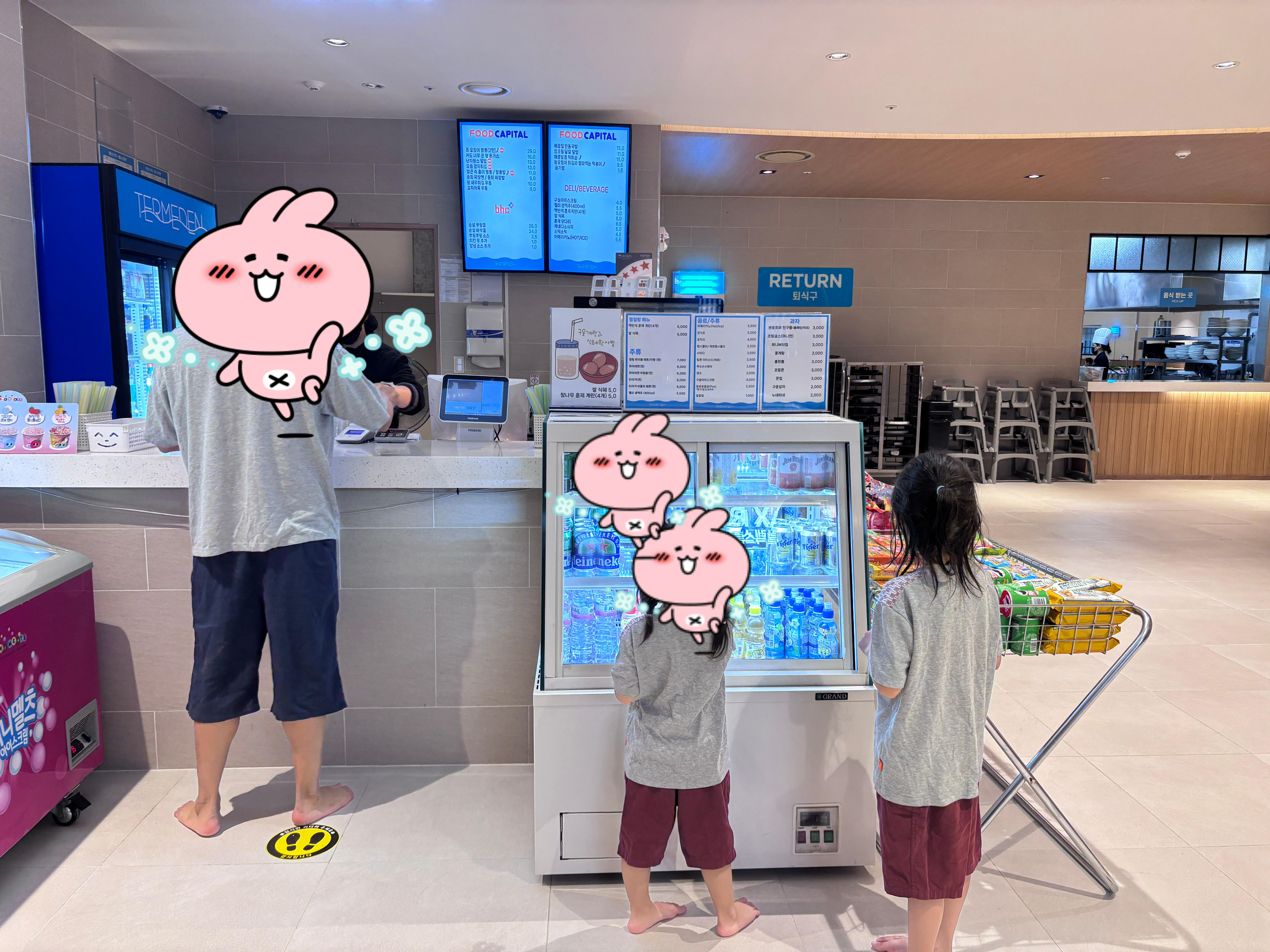매점과 푸드코트가 따로 있는데 식혜와 음료수로 저희는 목만 축여보았습니다. 그리고 아이들이 간단하게 책을 읽을 수 있게 키즈 라이브러리가 마련이 돼있어서 거기서 아이들이 책도 두어 권씩 읽고 나왔어요. 키즈 라이브러리 옆에는 안마의자가 있어서 남편과 교대로 한 명이 책 읽어 주면 한 명은 가서 마사지하고 그랬어요. 안마의자도 락커키로 결제됩니다.