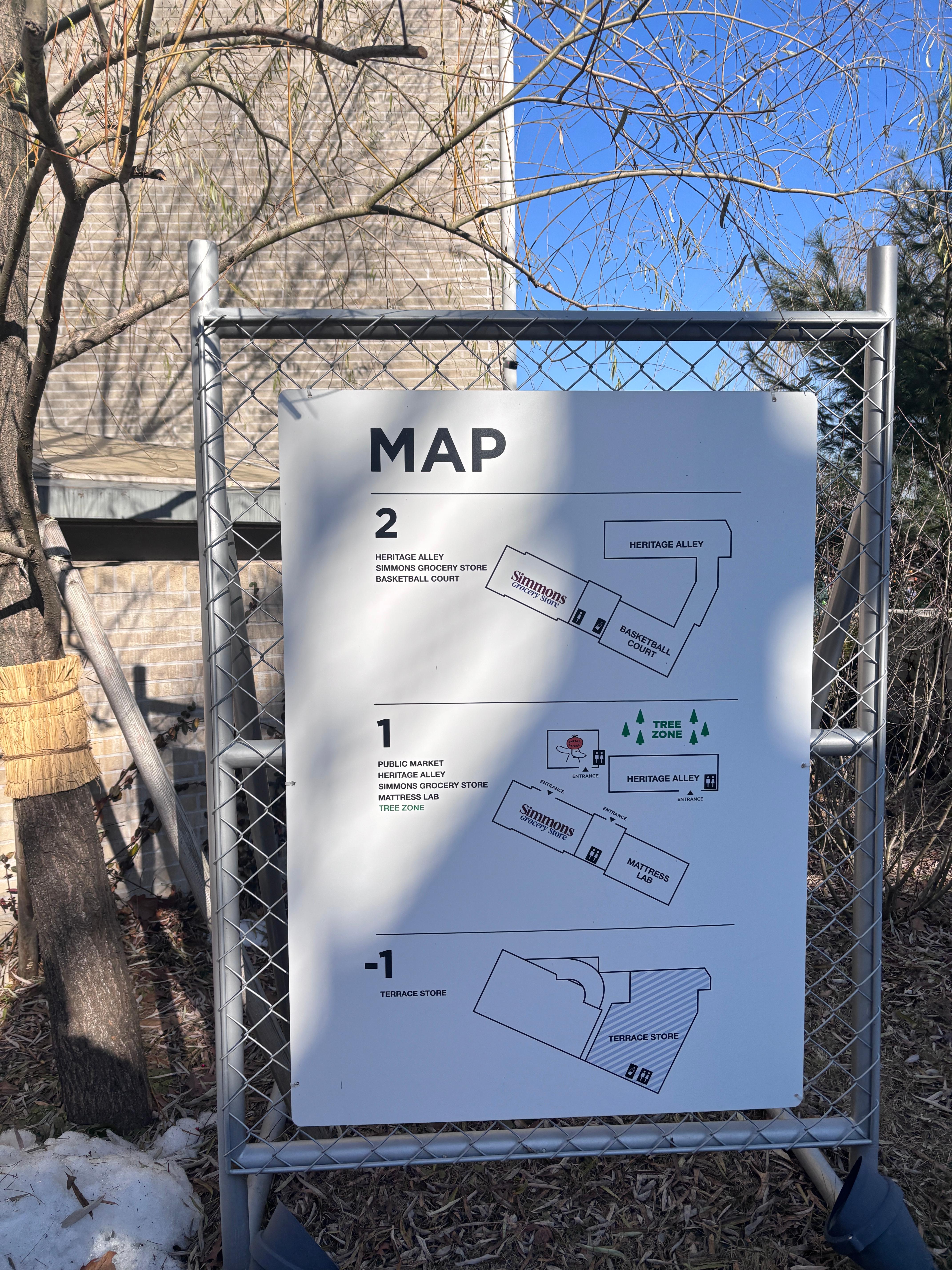 밖이 너무 추워서 안으로 들어가보기로 했어요. 지하 1층엔 시몬스 침대 매장이 있고 1층엔 시몬스 그로서리 스토어와 매트리스 랩, 2층엔 해리티지 엘리와 농구코트가 있습니다.