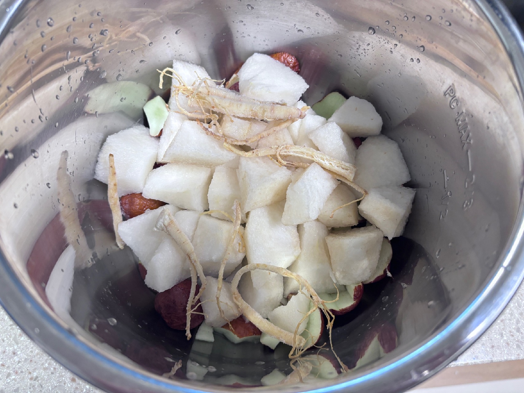 배(1개), 대추(배의 1/2정도), 인삼(있어서 잔뿌리만), 물